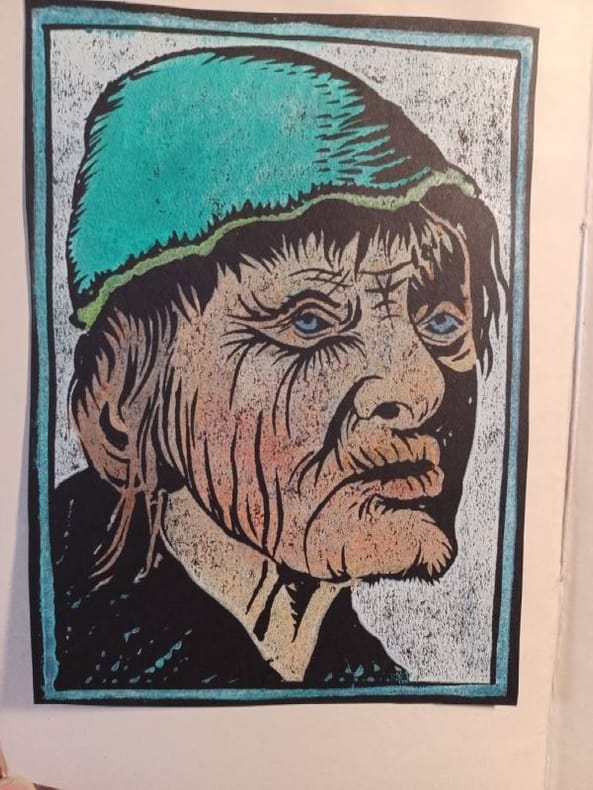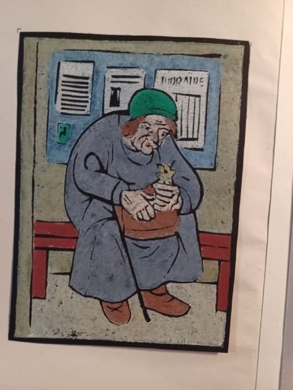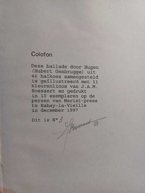 Marist-Press, Habay-la-Vieille, 1997. Un volume broché (15 x 21 cm) de 12 pages. 11 linogravures en couleur. Exemplaire en bon état. Un des 10 exemplaires numérotés avec un des plaques de linoleum originales gravées.