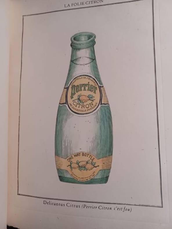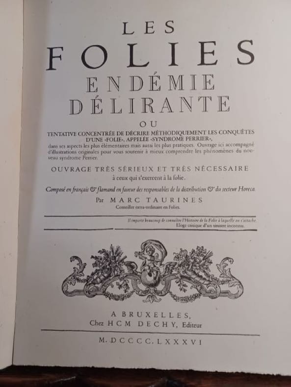 Bruxelles, Dechy, 1986. Un volume relié (31 x 24 cm) non paginé. Reliure d'éditeur skyvertex vert, titre imprimé en doré. Exemplaire en bon état. Jolie "tentative concentrée de décrire méthodiquement les conquêtes d'une folie appelée "syndrome Perrier", à la manière des ouvrages du XVIIIème siècle. Mention de tome Ier, en fait un seul volume publié, 9 planches hors texte en couleurs.