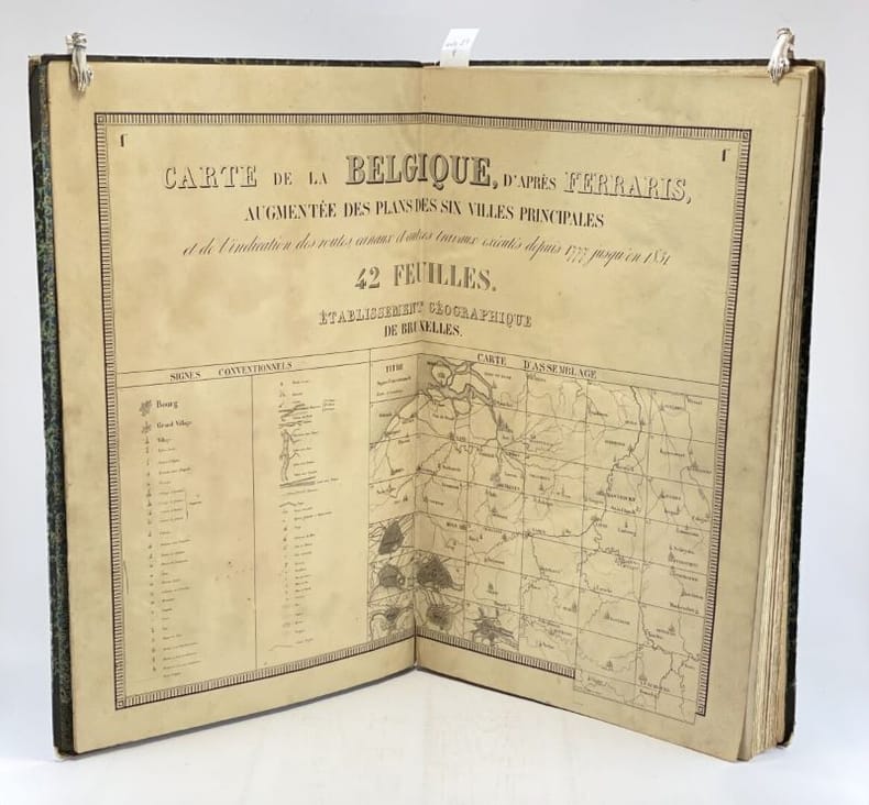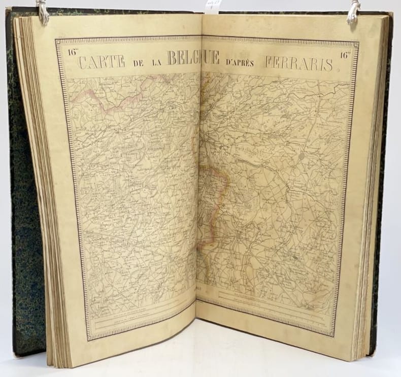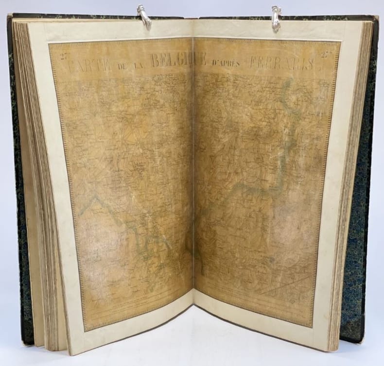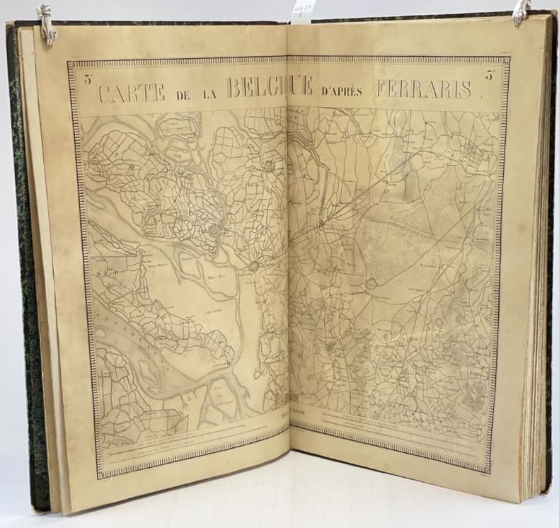 Bruxelles, Établissement géographique, s.d. Un volume relié (53,5 x 36 cm) de 43 ff. de planches. Relure demi-chagrin vert sombre à coins. sReliure usée mais encore solide, manques de cuir au bas du dos. Le papier a plus ou moins bruni par zones (traces d'humidité?), quelques très rares petites déchirures marginales sans manque, trace brune opaque sur la partie droite de la pl. 31. Ensemble exceptionnellement complet des 42 cartes + 1 planche commune aux cartes 41 et 42. Les cartes n° 2, 9, 27, 31 ont été remontées. La 27 présente une qualité de papier différente des autres.