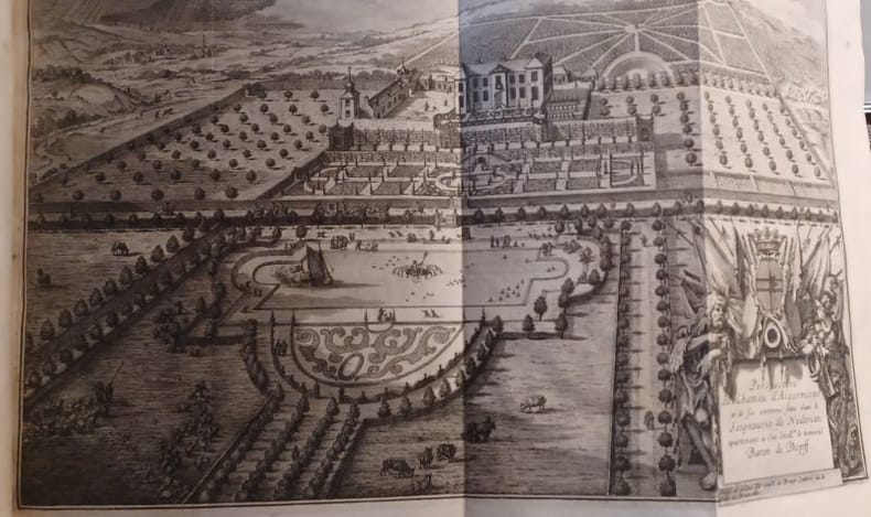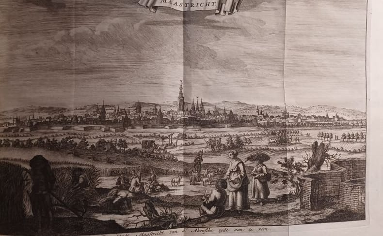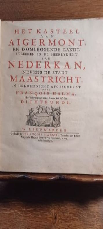 Edition unique très rare de ce long poème élogieux sur Château Neercanne et la ville de Maastricht, écrit par le prolifique imprimeur, éditeur et libraire hollandais F. Halma. Illustré avec 3 belles planches montrant le château et ses grands jardins en terrasse, une grande vue panoramique de Maastricht et une vue de la carrière souterraine de calcaire sous le mont Saint-Pierre ("St. Pieters Bergh par Maastricht soo als die sich onder de Aarde vertoont"), montrant les deux carriers au travail et des touristes en pantalon fantaisie recevant une visite guidée dans la grotte artificielle. Le château de Neercanne (ou "d'Agimont", à ne pas confondre avec le château voisin d'Aigremont au sud-ouest de Liège) est situé juste au sud de Maastricht, et juste au nord des villages belges de Kanne (Limbourg) et Eben- Emael (Liège), sur un site déjà utilisé par les Romains. Le bâtiment actuel, de style baroque néerlandais, a été conçu et construit en 1698 par Daniël Wolf van Dopff (1650-1718), seigneur de Neercanne, gouverneur militaire de Maastricht et dédicataire du livre de Halma, comme résidence de campagne pour les fêtes et comme maison d'hôtes. Son invité le plus célèbre était le tsar russe Pierre le Grand en 1717, lors de son deuxième voyage aux Pays-Bas. Le château de Neercanne est le seul château en terrasse du Benelux.