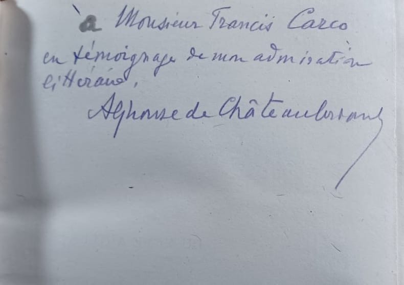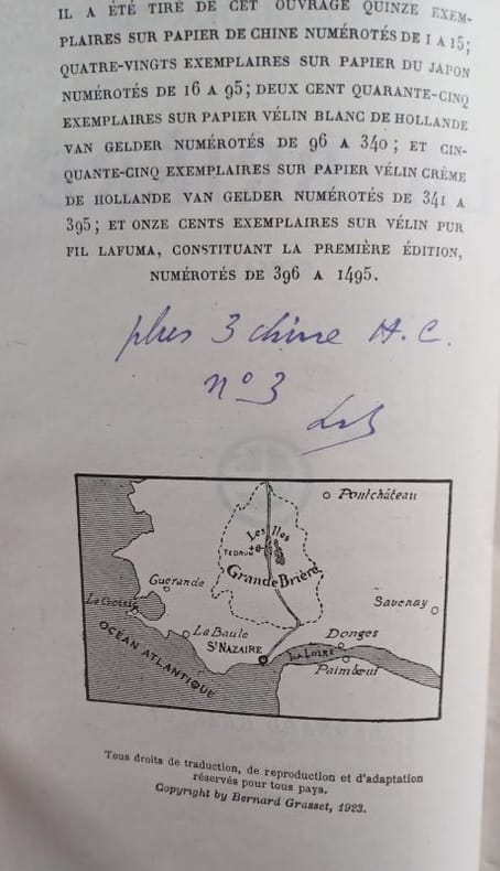 Paris, Bernard Grasset, 1923. 19,5 x 13,5 cm, (8)-424 pp. Relié demi maroquin vert à coins, dos lisse orné d'un arbre mosaïqué, tête dorée, date dorée en pied, couvertures et dos conservés (reliure signée Bernasconi). Bel exemplaire. Bel ex-libris contrecollé sur la page de garde, non identifié. Édition originale. Justifié à la main, un des 3 exemplaires sur Chine hors commerce, non annoncé. Exemplaire grand de marges. Envoi a.s. de l'auteur à Francis Carco.