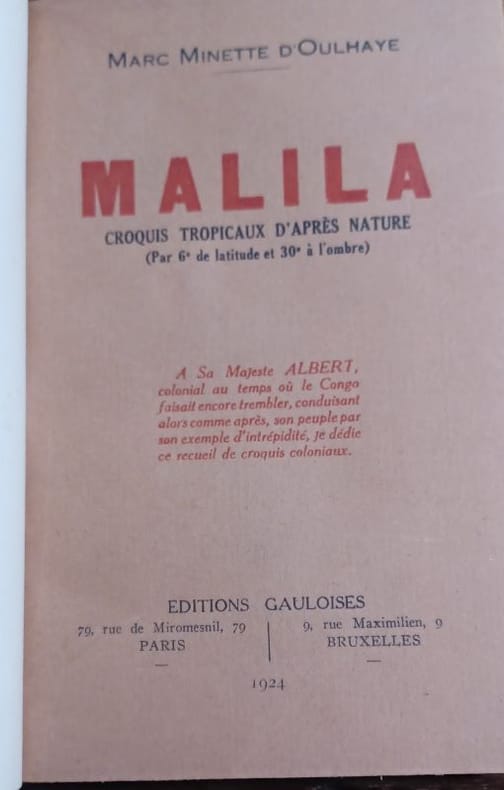 Malila. Croquis tropicaux d'après nature (par 6° de latitude et 30° à l'ombre). (Bruxelles: Editions Gauloises, 1924). [M.C.: Afrique noire, Congo belge, récit]