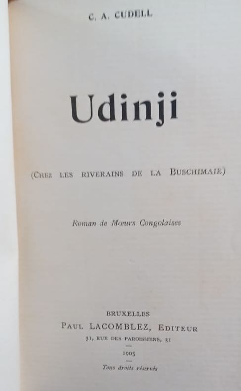 Bruxelles, Paul Lacomblez, 1905. 19 x 12 cm, 222 pp. Reliure pleine basane grise, décors qui parcourent les deux plats et le dos de motifs géométriques de filets à froid et de bandes mosaîquées, dos lisse, titre en long à froid, couvertures et dos conservées, sous étui. (reliure signée Beenkens). Étui usé sinon bon exemplaire. Édition originale sur papier vergé. "Les historiens de la littérature belge d'inspiration congolaise ont unanimement attribué une carrière africaine à l'auteur d'Udinji... l'auteur du roman est en réalité le frère aîné d'Alfred Cudell, Charles, auteur de plusieurs plaquettes et de deux nouvelles au moins. Charles Cudell reconnaît cependant avoir écrit Udinji sur les notes et documents de son frère." Réf. : Biographie coloniale belge, tome II Col. 216.