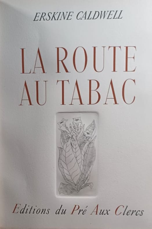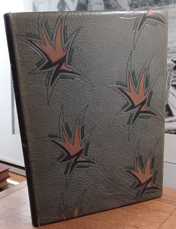Éditions du Pré Aux Clercs, Paris, 1946. In-folio 33 x 25 cm, 183 pp. Relié plein maroquin vert, dos lisse, titre doré et à froid, plats ornés de motifs de feuilles de tabac mosaïqués en trois couleurs, doublure et garde de cuir gris, tête dorée, non rogné, couverture et dos conservés (reliure signée Beenkens, Bruxelles). Illustrations par Denyse de Bravura gravées sur cuivre. Tirage limité à 900 exemplaires. Un des 400 sur papier de Rives numérotés. Frottement sur les coupes sinon très bel exemplaire.