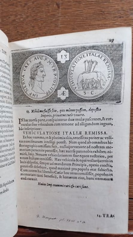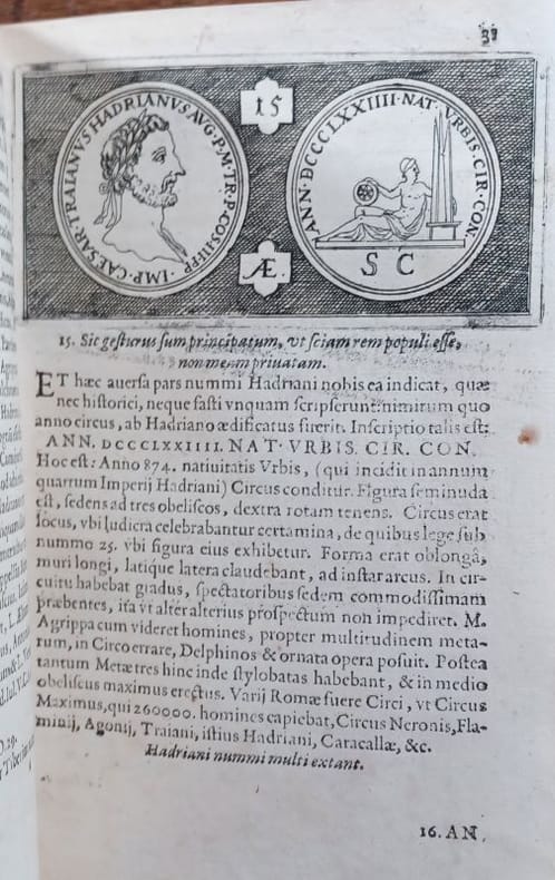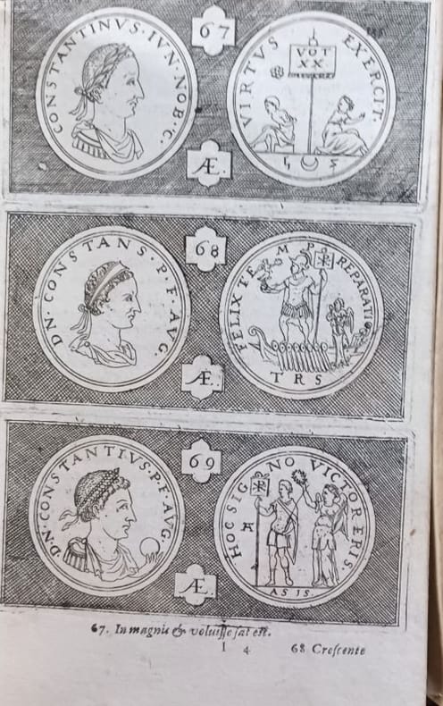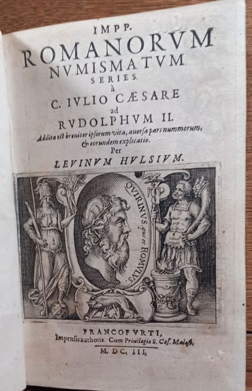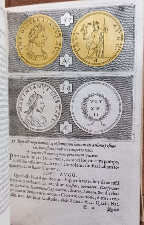 Impensis Authoris, Francofurti, 1603. 15,5 x 11 cm, 8 ff., 305(1) pp., 3 ff. Avec 150 illustrations en taille-douce de monnaies et médailles sur fond noir, dont certaines ici sont colorées en jaune. Page de titre gravée, et gravure à pleine page au verso. Relié plei vélin d'époque, dos lisse, titre manuscrit. Très bel état de la reliure et de l'ouvrage en général.Tampon sur deux pages de garde de J.C.J. MALENGREAU.