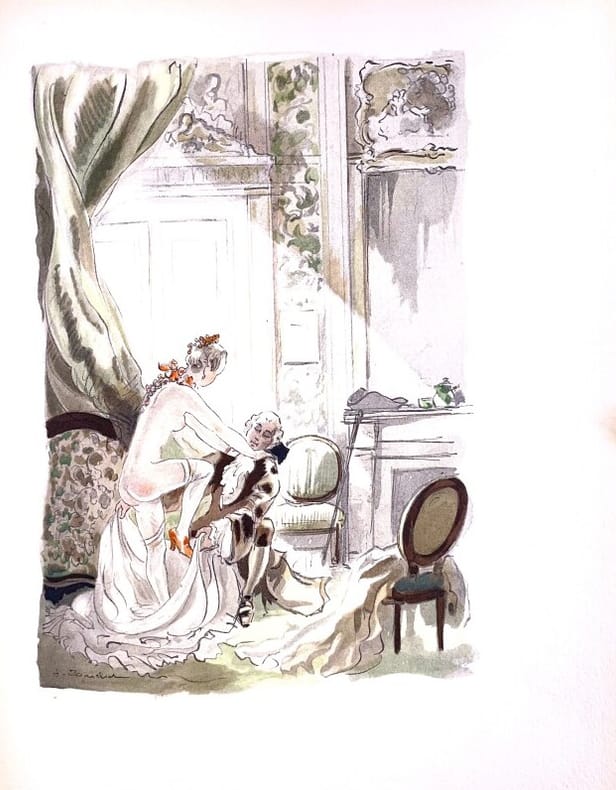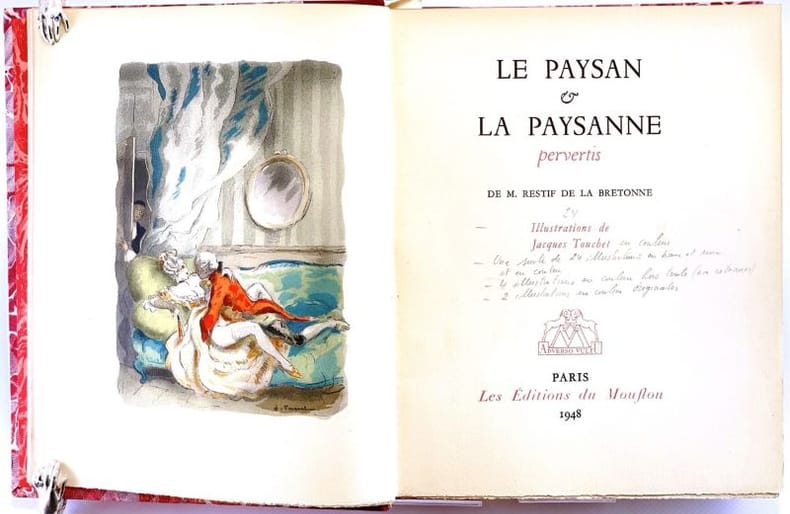 Paris, Les Éditions du Mouflon, 1948. 25,5 x 21 cm, 189-[5] p. + suite. Relié, demi-chagrin vermillon, couv. cons. Édition illustrée de compositions en couleurs in et hors-texte de Touchet, tirage à 588 ex., celui-ci est un des quelques H.-C. tirés en outre, sur papiers divers, en l'occurence sur vélin pur fil du Marais. Il comporte une suite non annoncée à la justification, plus étoffée encore que celle des ex. de tête, composée comme suit : 1 suite complète des 24 illustrations (19 en couleurs et 5 en noir) ; 4 compositions en couleurs non retenues ; et 2 illustrations originales en couleurs, à savoir 1 dessin original signé au crayon b.g. qui correspond à l'illustration p. 133 avec de minimes variantes, et une seconde planche en couleurs dont nous n'avons pu déterminer avec certitude s'il s'agit également d'un dessin original ou d'une lithographie rehaussée. Cette dernière est une variante de l'illustration p. 57 avec d'importants changements. Bel et curieux exemplaire.