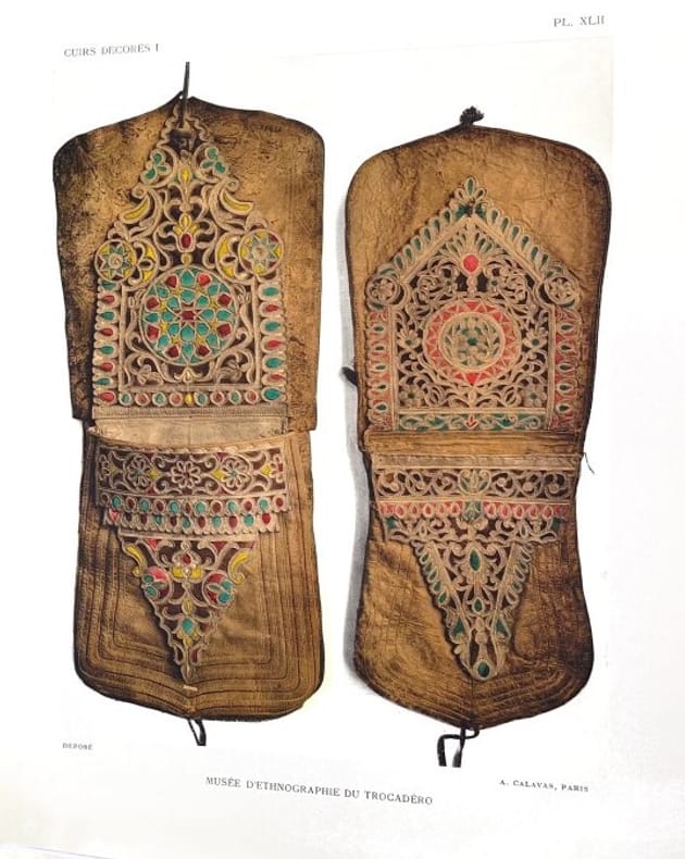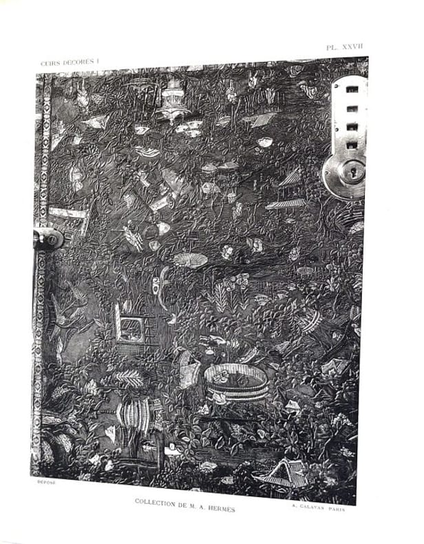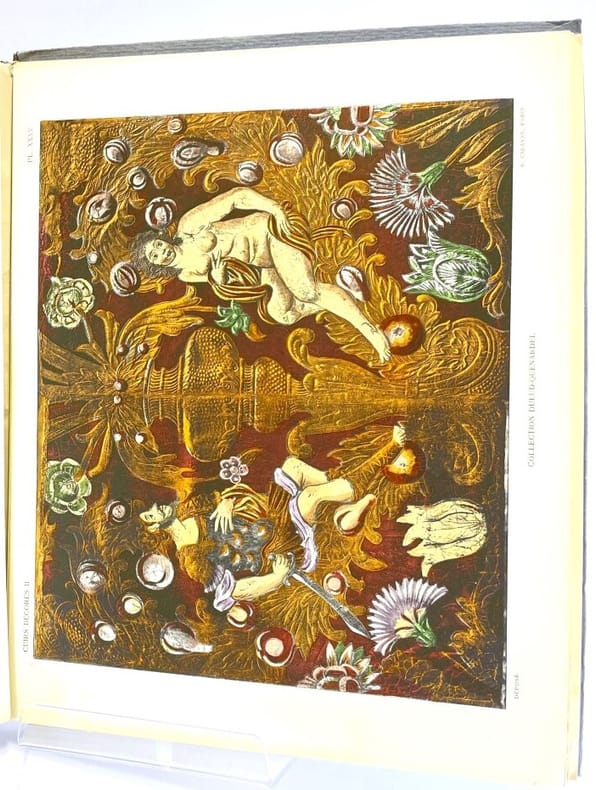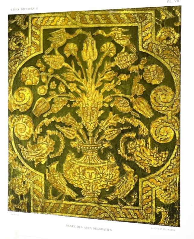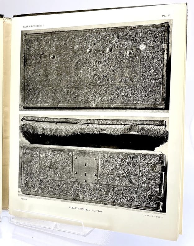 Paris, Librairie des Arts Décoratifs, A. Calavas, s.d. 33,5 x 26 cm, 2 vol. en ff., couvertures bleues rempliées avec étiquette de titre au plat. Complets des planches, préfaces et tables descriptives. Dos passés, petites fentes, sinon bon état. - Vol. I. Cuirs exotiques, 42 planches dont 6 coul. - Vol. II. "Cuirs de Cordoue", 48 planches dont 6 coul.