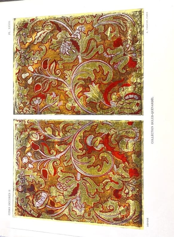 Paris, A. Calavas, s.d. 2 volumes in-4 en feuilles sous portefeuille souples de l’éditeur.I. Cuirs exotiques. 42 planches.II. Cuirs de Cordoue. 48 planches.