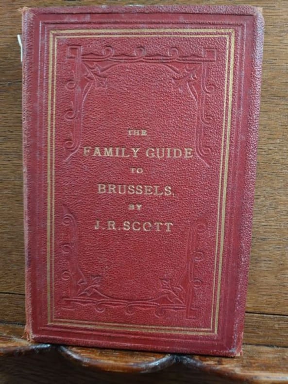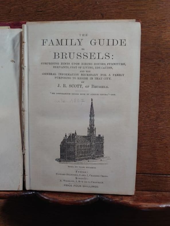 London, E. Stanford. Brussels, A. Vromant, sans date [circa 1870]. 18 x 12 cm, 146-14 pp. Relié cartonnage d'éditeur, titre doré au dos et sur le premier plat, tranches dorées. Cartonnage en bon état, mais ouvrage dérelié. Contrecollées sur les pages de garde des cartes de visite anciennes de magasin et d'hôtel bruxellois. Provenance : bibliothèque de l'architecte A. Fritz, ex-libris et numéro d'inventaire.