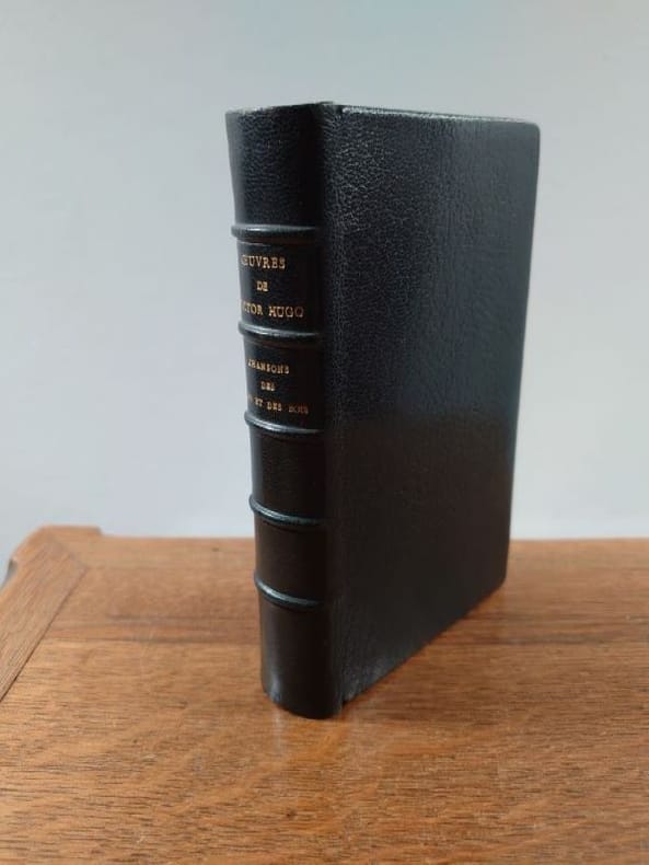 12,5x20,5 cm, 434 pages, très bon état, plein cuir bistre, tabac foncé, dos avec pièces de titre et entre nerfs dorés, quelques menues marques et griffures sur le plat supérieur, tranchefile et signet, plats enluminés, portrait en frontispice, Collection distribuée par le Cercle du Bibliophile, imprimé en Suisse, cinq dessins de Gill extraits de sa parodie de Victor Hugo, "Les Chansons des Grues et des Boas", Paris, 1866 et sept gravures à pleine page tirées de l'édition Eugène Hugues de l'oeuvre poétique de Victor Hugo, ouvrage réalisé d'après les maquettes de Gilbert Gilliéron -