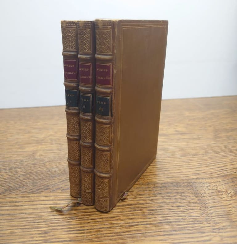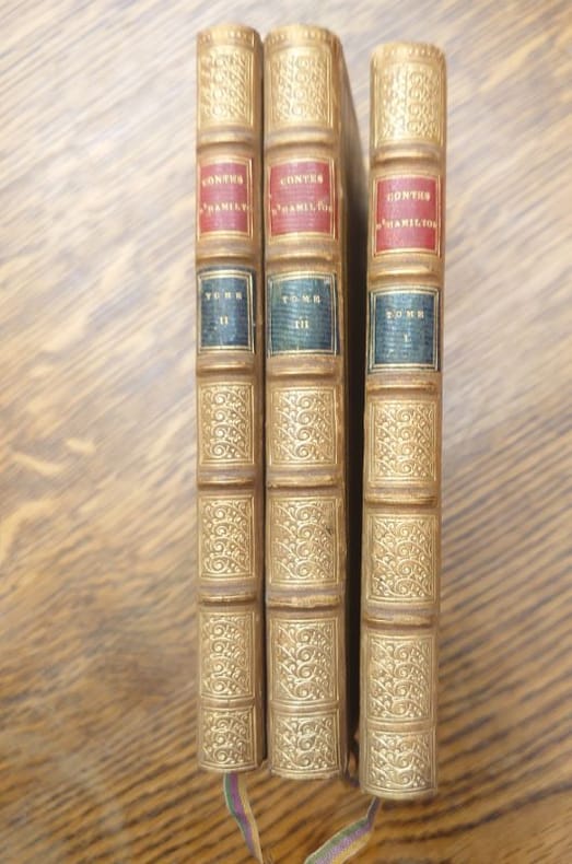 Paris, Didot l'Ainé, 1815. 13,5 x 9,5 cm, 190 - 154 et 194 pp. Trois volumes reliés plein veau, dos à nerfs, caissons ornés, pièces de titres rouges et noires, encadrements de triples filets dorés sur les plats, encadrements de roulettes sur les contreplats, filets sur les coupes et les coiffes, toutes tranches dorées. Reliures signées L. Pouillet. Reliures très légèrement usées, quelques traces de frottements sinon beaux exemplaires sur papier vélin. Renferment : Le Bélier. Histoire de Fleur d'Épine. Les quatre Facardins.