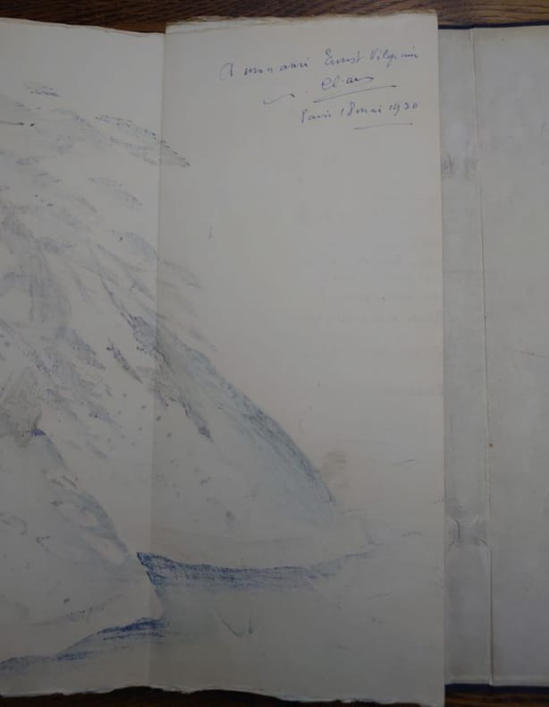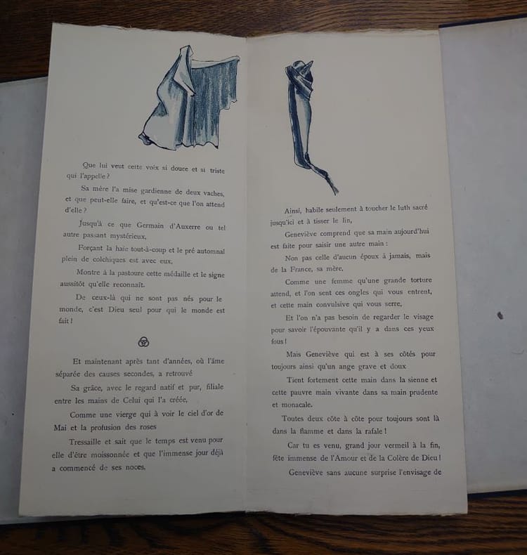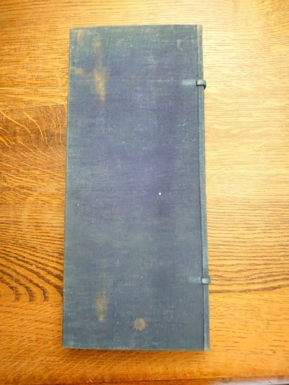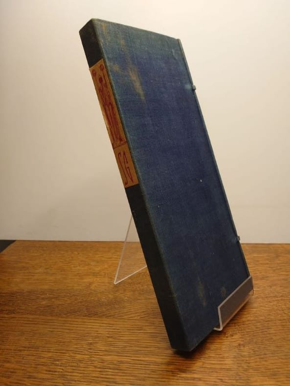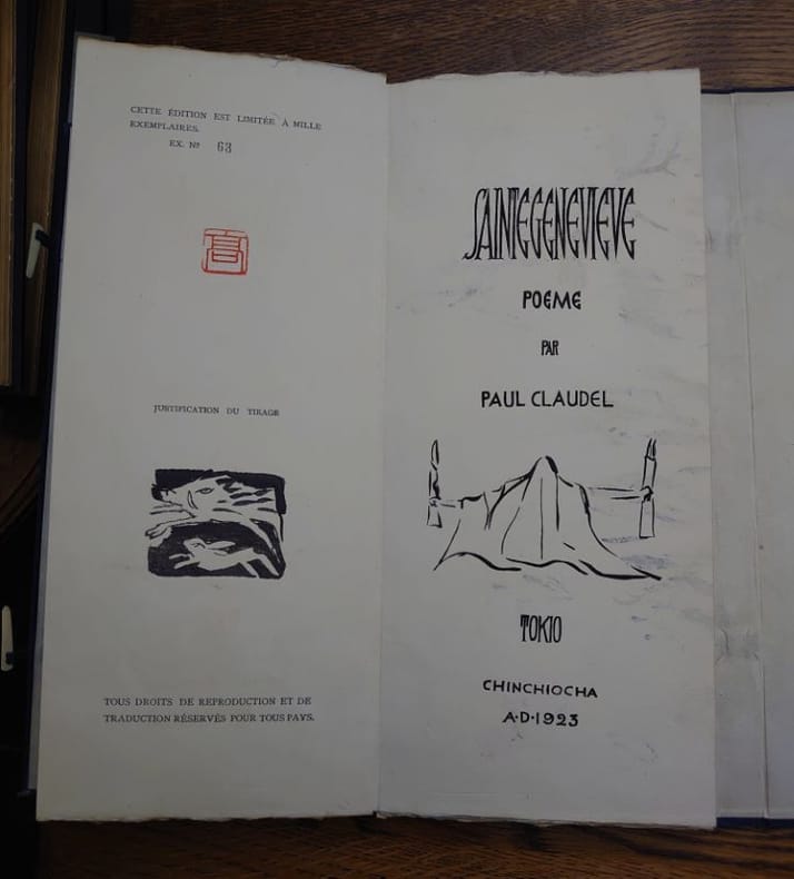 Tokyo, Chinchicha, 1923. 33 x 13 cm, 38 feuillets pliés à la japonaise (leporello), sous ais de bois sous étui d'édition de toile bleue fermé à la japonaise, fermoirs en ivoire, étiquette imprimée au dos de l'étui. Toile de l'étui tachée sinon bel exemplaire. Édition originale, un des 1000 exemplaires numérotés sur papier spécial dit "Hôcho", avec filigrane SG, seul tirage avec 12 exemplaires de grand luxe et 6 hors commerce. Ouvrage illustré de 14 dessins dans le texte d'Audrey Parr gravés sur bois par Bonkotsu Igami, "d'après le procédé japonais", d'une composition en couleur de Keisen Tomita (au verso), gravée par Bonkotsu Igami illustrant un poème autographe en fac-similé, page de titre dessinée par Noémi Pernessin. Envoi autographe signé de l'auteur à Ernest Vilgrain. Ernest Vilgrain, né le 20 octobre 1880 à Frouard et décédé le 16 janvier 1942 à Marlotte, est un industriel minotier qui a été chargé du ravitaillement dans le gouvernement de Georges Clemenceau de 1917 à 1920.