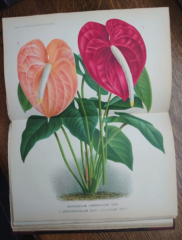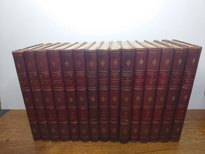 Gand, Bureau de la Revue, 1875 à 1889. 26,5 x 18 cm, quinze volumes reliés demi-chagrin rouge à coins, dos à nerfs, caissons ornés, couvertures conservées, reliures légèrement usées, traces de frottements sinon très beaux exemplaires. Tome 1 : 1875, 283 pp., 12 planches coloriées, une planche en noir et banc et de nombreuses figures. Tome 2 : 1876, 292 pp., 12 planches coloriées, 2 planches en noir et banc et de nombreuses figures. Tome 3 : 1877, 288 pp., 14 planches coloriées, 9 planches en noir et banc et de nombreuses figures. Tome 4 : 1878, 288 pp., 13 planches coloriées, 14 planches en noir et banc et de nombreuses figures. Tome 5 : 1879, 287 pp., 13 planches coloriées, 11 planches en noir et banc et de nombreuses figures. Tome 6 : 1880, 288 pp., 12 planches coloriées avec 24 figures, et de nombreuses gravures et figures en noir en blanc. Tome 7 : 1881, 288 pp., 12 planches coloriées, 11 planches en noir et blanc et de nombreuses figures en noir en blanc. Tome 8 : 1882, 288 pp., 12 planches coloriées, et de nombreuses planches et figures en noir en blanc. Tome 9 : 1883, 288 pp., 12 planches coloriées, et de nombreuses planches et figures en noir en blanc. Tome 10 : 1884, 288 pp., 12 planches coloriées, et de nombreuses planches et figures en noir en blanc. Tome 11 : 1885, 288 pp., 22 planches coloriées, et de nombreuses planches et figures en noir en blanc. Tome 12 : 1886, 288 pp., 22 planches coloriées, et de nombreuses planches et figures en noir en blanc. Tome 13 : 1887, 288 pp., 23 planches coloriées, et de nombreuses planches et figures en noir en blanc. Tome 14 : 1888, 296 pp., 24 planches coloriées, et de nombreuses planches et figures en noir en blanc. Tome 15 : 1889, 288 pp., 24 planches coloriées, et de nombreuses planches et figures en noir en blanc.