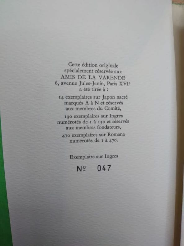 Paris, Les Amis de La Varende 1988, 205x115mm, 91pages, En feuilles sous couverture rempliée. Edition originale sur papier Romana 75/470. Très bel exemplaire.