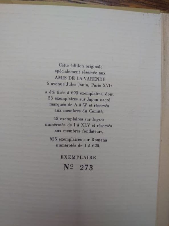Pour les amis de la Varende, 1975. 20,5 x 11,5 cm, en feuilles sous couverture rempliée, 53 pp. Bel exemplaire. Un des 625 ex. num. sur Romans.