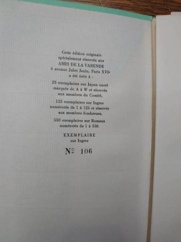 Pour les amis de la Varende, 1981. 20,5 x 11,5 cm, en feuilles sous couverture rempliée, 70 pp. Exemplaire avec des rousseurs. Un des 625 ex. num sur Romana.