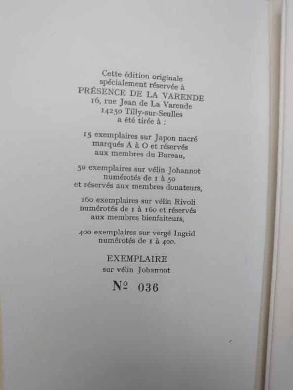 Présence de la Varende, 1994. 20,5 x 11,5 cm, en feuilles sous couverture rempliée, 25 pp. Bel exemplaire. Un des 50 ex. num sur vélin Johannot réservés aux membres donateurs.