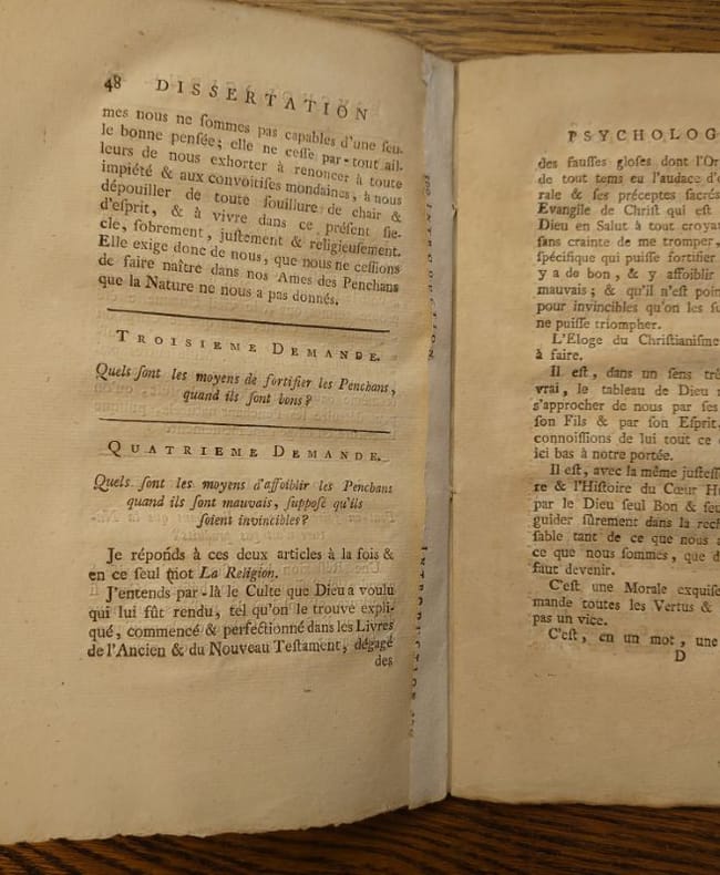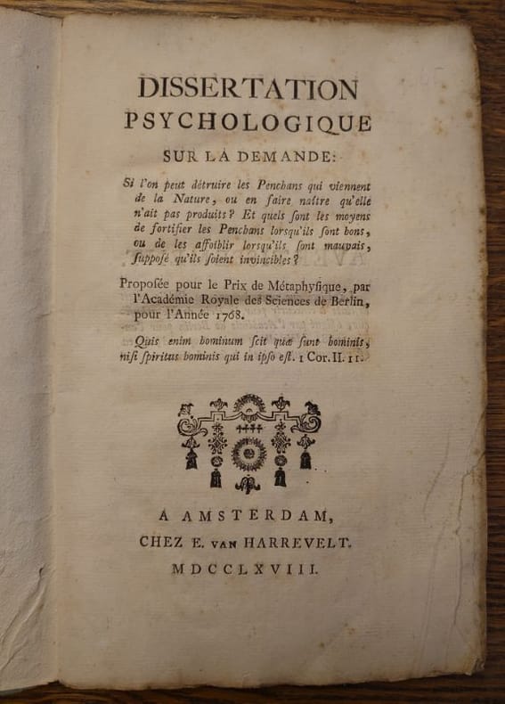 A Amsterdam, chez E. van Harrevelt, MDCCLXVIII (1768). 21 x 13,5 cm, 63 pp. Broché en couverture d'attente, étiquette au dos. Couverture légèrement salie sinon bon exemplaire. "Avertissement. La pièce que nous donnons au public, était destinée à concourir pour le Prix de Métaphysique, assigné par l'Académie de Berlin pour l'année 1768. Mais elle y arriva trop tard, & en est revenue toute cachetée à son auteur."Rarissime.