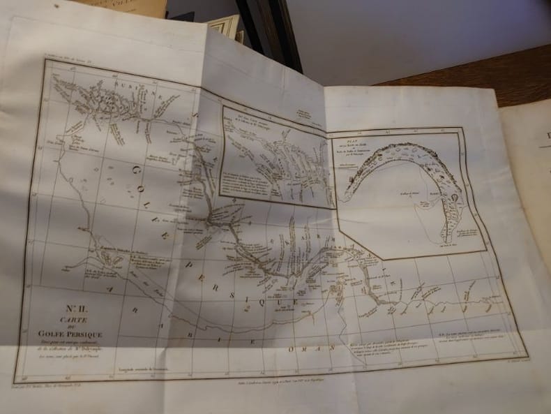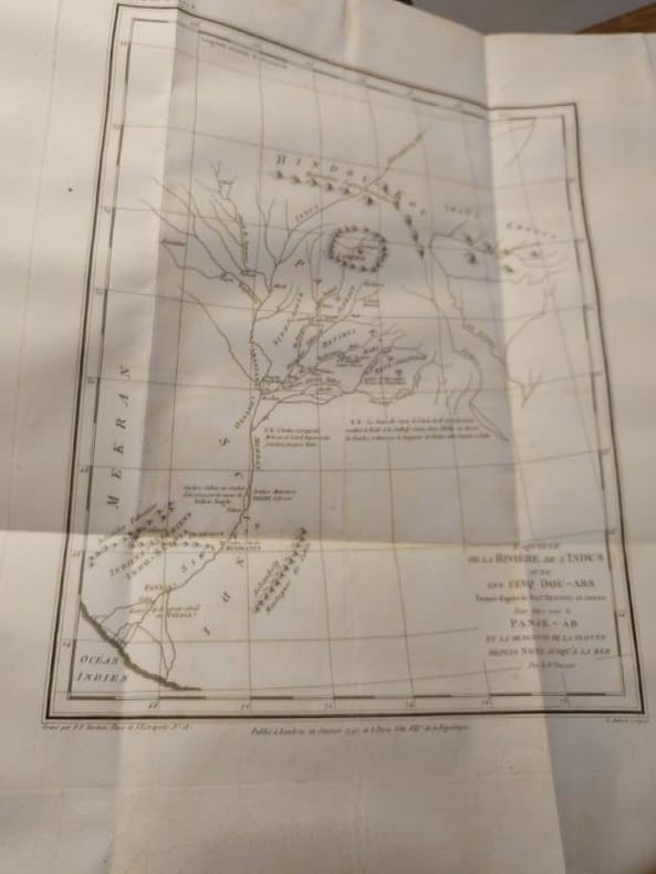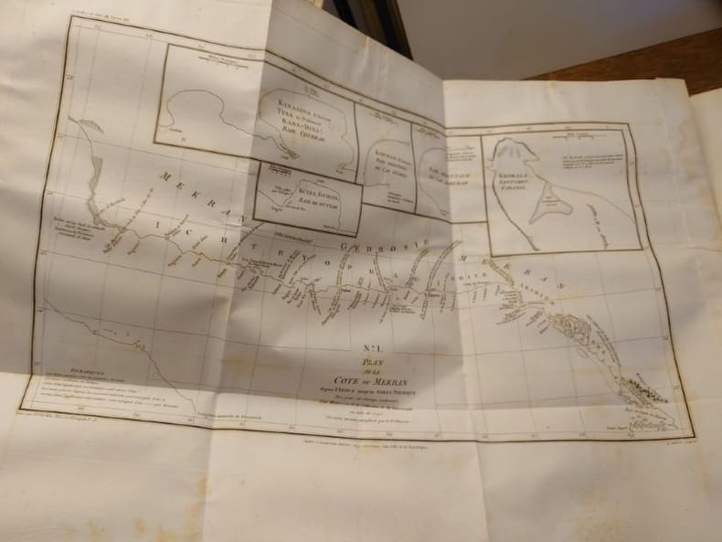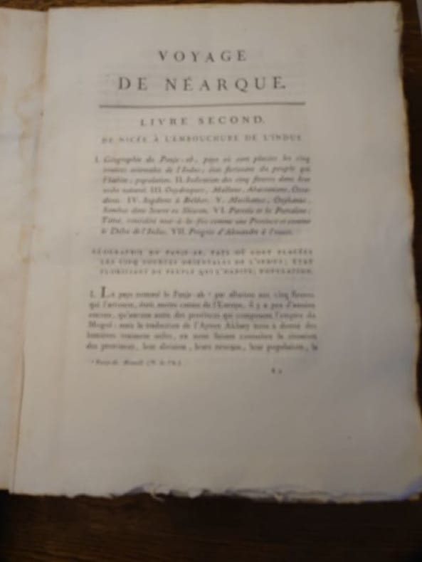 Paris, de l'Imprimerie de la République, An VIII (1799 / 1800). 23,5 x 31 cm, xx-661 pp. Broché en couverture d'attente, première de couverture détachée, un feuillet détaché, des tâches d'encre marginales sur plusieurs pages dont les pages 9,16 et 645, sinon bon exemplaire en grande partie non coupé. Avec un frontispice gravé (avec des rousseurs), 6 cartes dépliantes gravées, une planche hors-texte gravée. Les planches sont en très bel état.