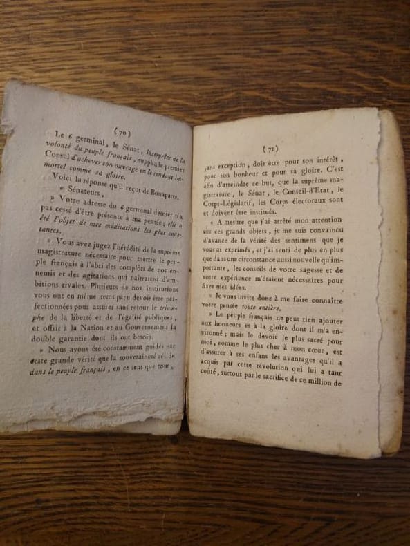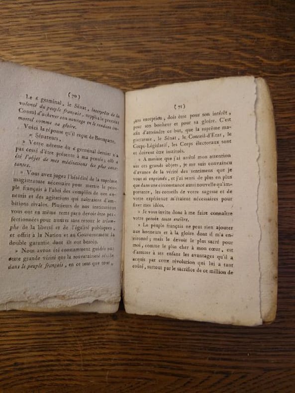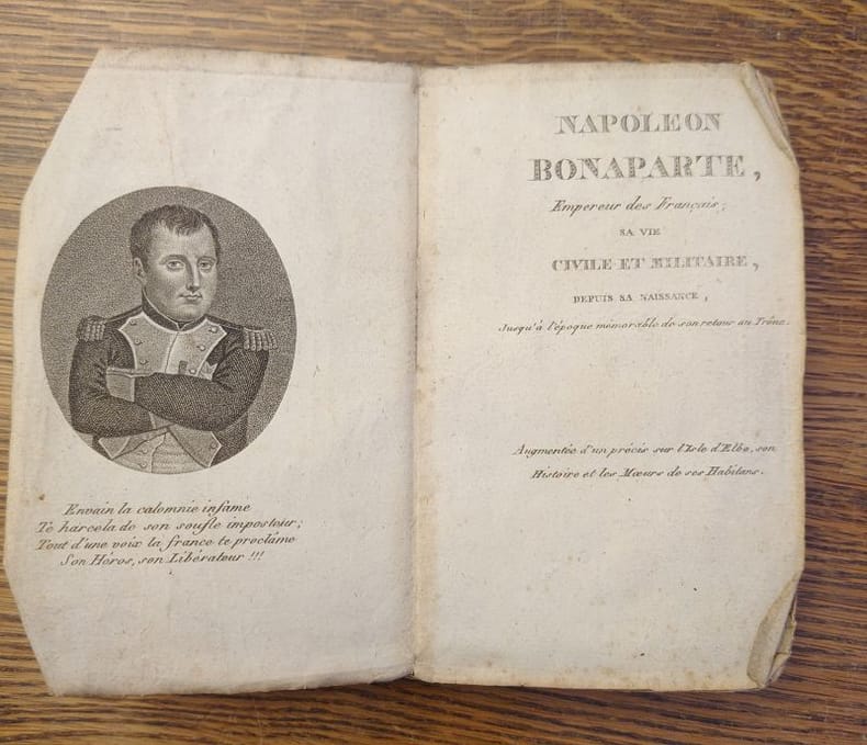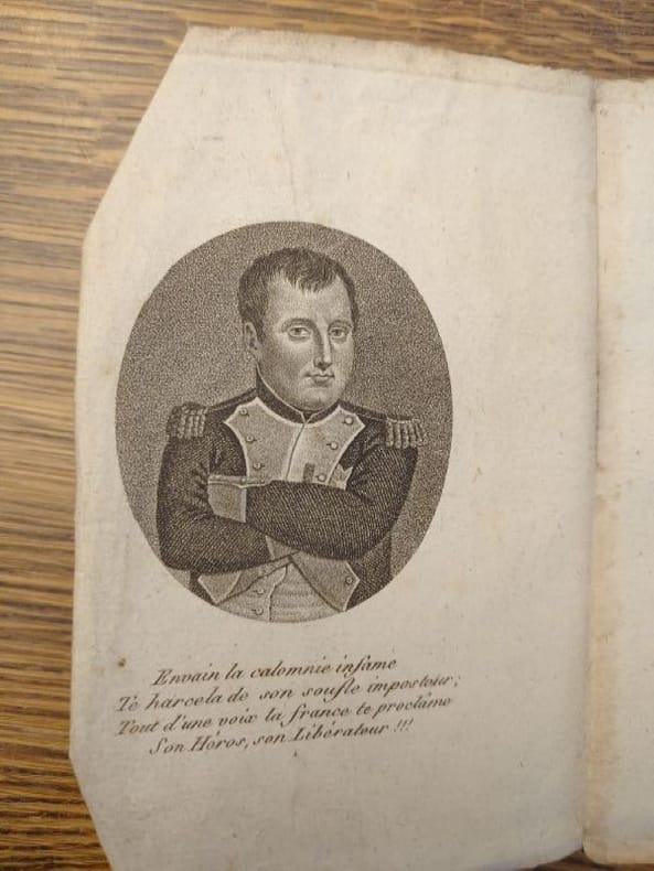 De l'Imprimerie d'Hernan, sans date (1815). 14, 5 x 9 cm, 171 pp. Ouvrage broché, en couverture d'attente, très usée et partiellement débroché. bien complet du portrait de Bonaparte en frontispice.