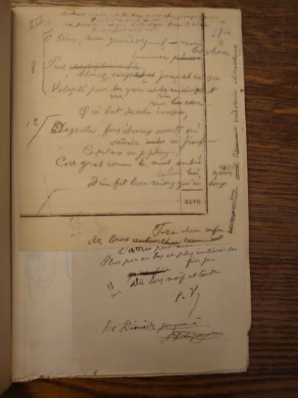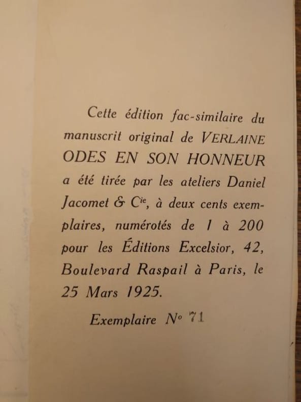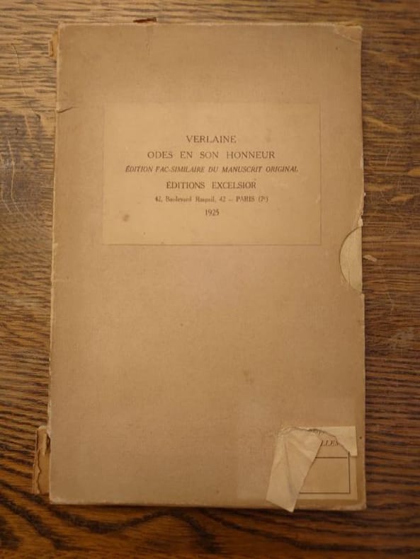 Paris, Éditions Excelsior, 1925. 22,5 x 14 cm, non paginé. Broché sous étui. Étui abîmé, déchirure au dos. Fac-similé du manuscrit original de ce texte écrit par Verlaine sur tous les papiers qui lui tombaient sous la main: feuilles de maladie, faire-part, dos d'enveloppes et de lettres, factures... Tirage à 200 exemplaires numérotés, imprimés par Jacomet.