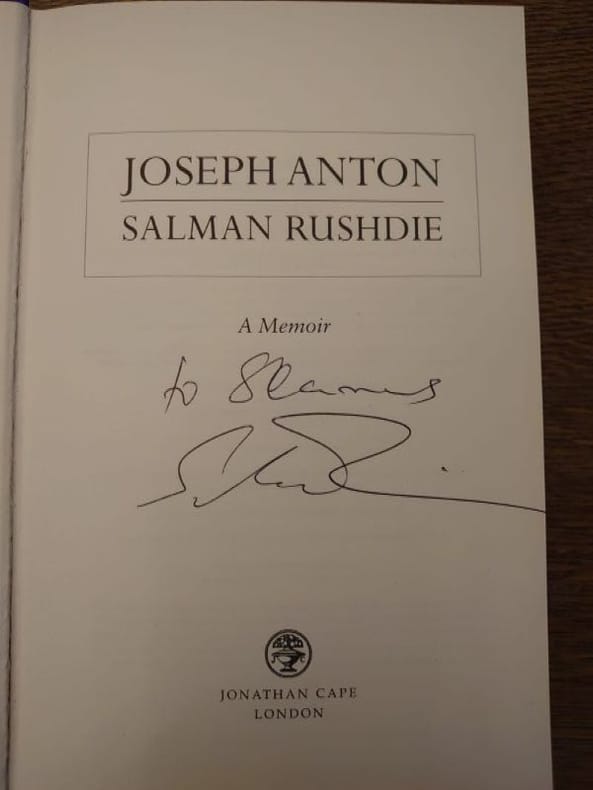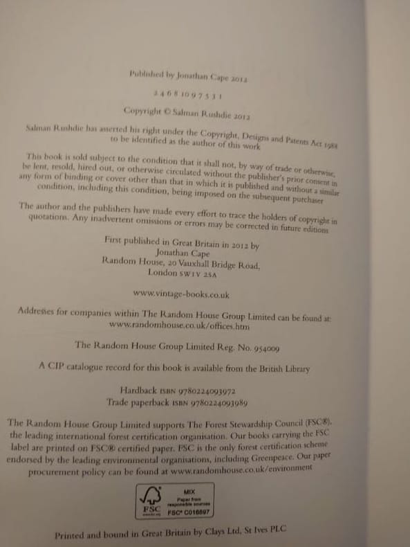 London, Jonathan Cape, 2012. 24 x 15,5 cm, 636 pp. Relié cartonnage d'éditeur sous jaquette illustrée. Envoi autographe signé de Salman Rushdie.