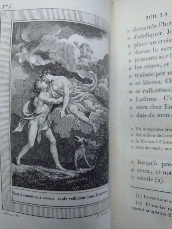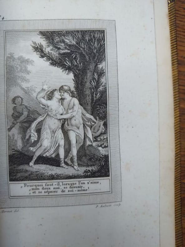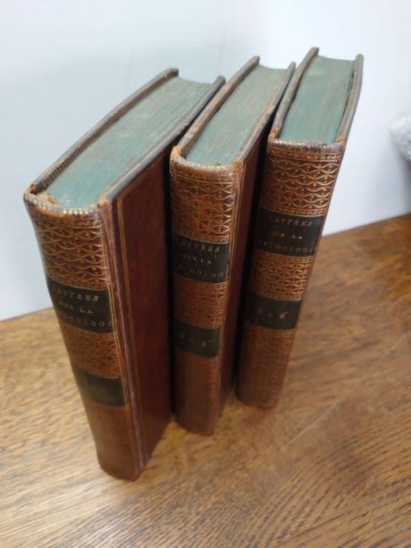 An IX, in-12 illustré d'un frontispice (portrait) et de 36 planches hors-texte, 6 parties reliées en 2 volumes : 5f., 113p. et 7f.; 118p. et 3f.; iv, 101p. et 1f.; iv, 108p. et 3f.; iv, 117p. et 3f.; et 143p. et 3f. :: Mythologie pour la jeunesse. Edition définitive publiée du vivant de l'auteur et corrigée par ses soins. Le portrait de l'auteur signé Ducreux, est gravé par Gaucher. Les 36 fines estampes encadrées et légendées dessinées par Monnet et sont gravées par Audouin. :: Reliure de l'époque, basane racinée, dos lisse orné, pièce de titre en rouge et de tomaison en vert, roulette encadrant les plats. Coins assez frottés, une coiffe avec petite perte, un mors forcé. Rousseurs éparses. Complet des 36 gravures.