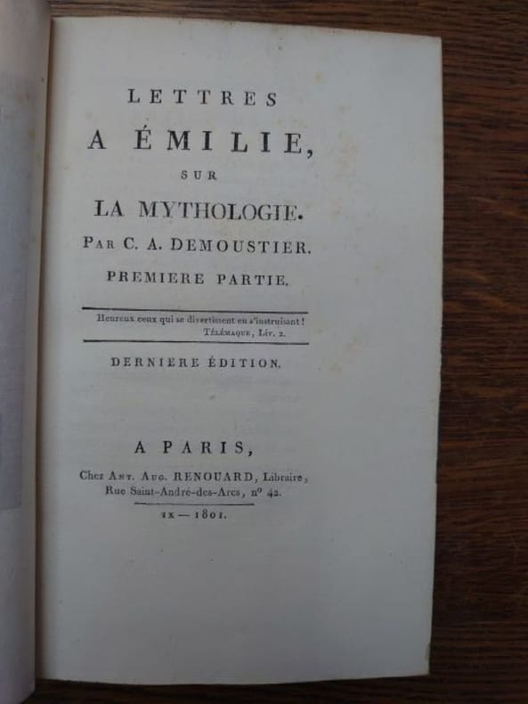 Paris, Ant. Aug. Renouard, 1801.6 parties en 3 volumes in-8° (20 x 13,2 cm), 4 ff.-135 pp.-5 ff. et 1 ff.-142 pp.-3 ff. et 2ff.-122 pp.- 2 ff. et 2 ff.-133 pp.-2 ff. et iv-146-4 ff. et 1 ff.-170 pp.-4 ff. Jolie illustration comprenant en premier tirage un portrait de l'auteur gravé par Gaucher d'après Ducreux et 36 figures de Monnet gravées par Audoin et Gaucher. Trois volumes reliés plein veau marbré, dos lisses richement décorés à la grotesque, pièces de titre, encadrement de triple filets dorés sur les plats, encadrements de cannelures dorés sur les contreplats, tranches bleus. Quelques traces de frottements, coins très légèrement émoussés sinon beaux et élégants exemplaires. Les Lettres à Émilie sur la mythologie, écrit en prose et en vers (prosimètre), sont constituées de leçons en forme de lettres adressées par un narrateur à sa jeune élève en vacances dont le modèle était sans doute la fameuse Marie-Guillemine Benoist, dont le salon de lhôtel de Vougy, duquel Demoustier fut lhôte assidu, était le rendez-vous de tout ce que Paris conservait de causeurs spirituels. L'ouvrage obtint le plus vif succès en son temps, et fit presque école. Il est en effet semé de traits desprit, de saillies et de madrigaux, qui en font une extraordinaire satire de la société du temps. Deux tampons sur les pages de garde, dates et signature.