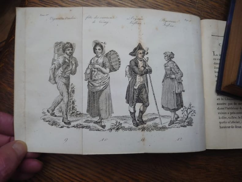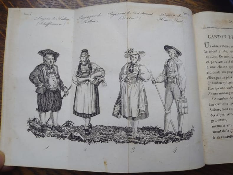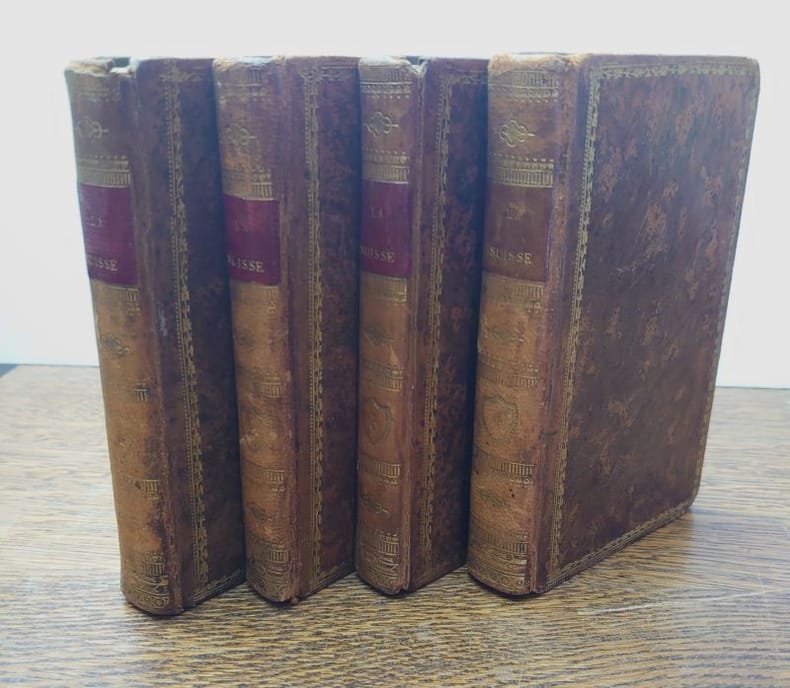 Paris, à la librairie d'Éducation d'Al. Eymery, 1822. 13,5 x 8,5 cm. Tome I. [4]-XII-184 pp. Tome II. [4]-188 pp. Tome III. [4]-184 pp. Tome 4. [4]-240 pp. Avec en tout 12 vues gravées de la Suisse, 4 planches présentant des costumes paysans, une planche de musique (Le Ranz des vaches), ainsi qu'une carte dépliante de la Suisse (avec une déchirure sans manque). Quatre volumes reliés plein veau raciné, dos lisses ornés, pièces de titre rouge, encadrements de roulettes dorées sur les plats. Reliures légèrement usées, dos légèrement passés, coins émoussés, quelques rousseurs sinon bons exemplaires.