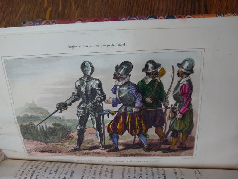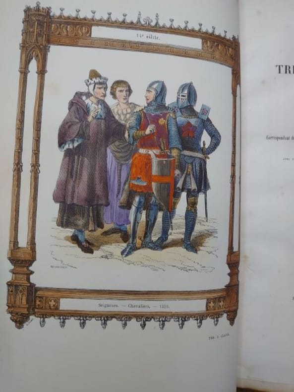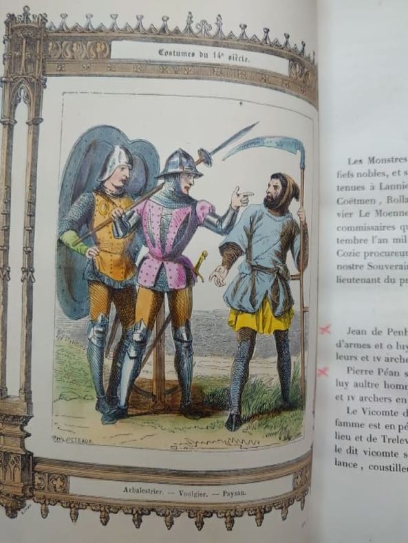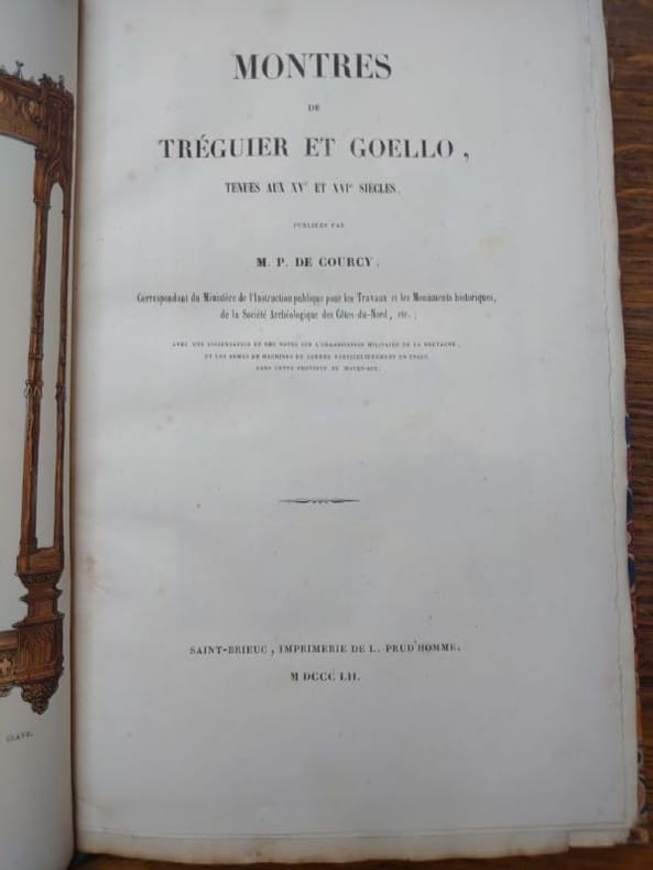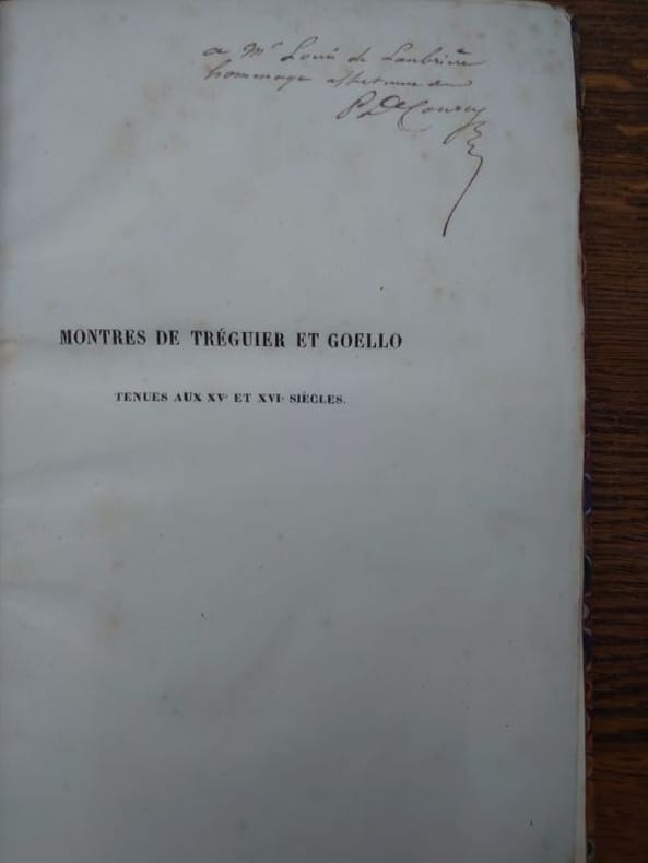 Saint-Brieuc, Imprimerie de L. Prud'Homme, 1852. 24,5 x 16 cm, pagination de 204 à 283 et 26 ff. manuscrits insérés in fine (Table des Paroisses mentionnés dans les deux Montres publiés par Mr de Courcy). Avec 10 planches gravées colorées à la main. Relié demi chagrin, dos à nerfs, titre doré, quelques traces de frottements sinon bel état. Quelques annotations manuscrites intéressantes, dans le texte. Envoi autographe signé de De Courcy à Mr Louis de Laubrière. Provenance : signature ex-libris de G. du Parc. De la famille Du Parc Locmaria.