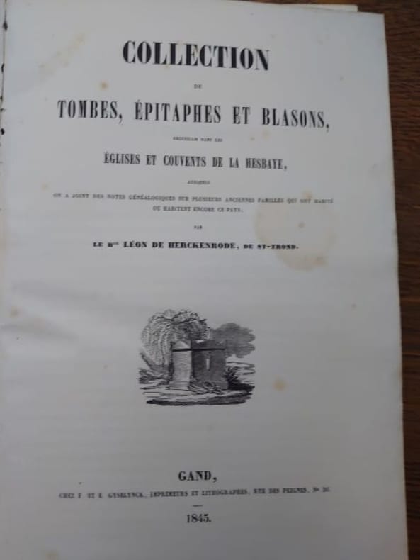 Gand, Gyselinck, 1845. 26 x 18 cm, 803 pp. avec 311 gravures en noir et blanc (blasons, inscriptions funéraires, armoiries, etc.). Relié demi basane, dos lisse, titre doré. Reliure usée, des épidermures, traces de frottements, mors légèrement fendu en haut du dos, premier feuillet détaché sinon bon exemplaire. Édition originale.