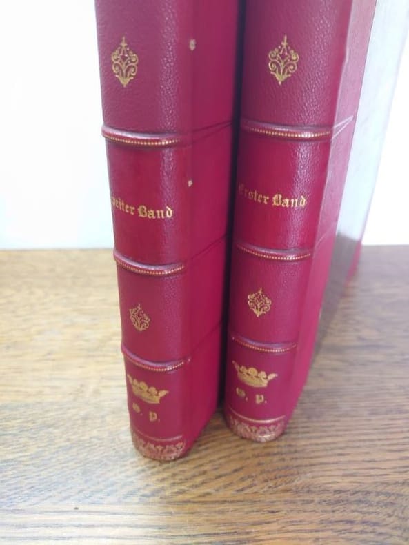 Leipzig, E. Twietmeyer, 1883. 28 x 23 cm, viii-328 pp.et (pagination continue) 329-696. Deux volumes reliés demi-chagrin à coins, dos à nerfs, caissons ornés, titres dorés. Traces de frottements sinon bel exemplaire. Au bas du dos initiales dorées G.P. et couronne comtale (vicomte Du parc Locmaria). Beaux exemplaires. Provenance ex-libris manuscrit de G. Du Parc.