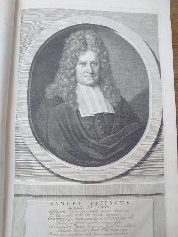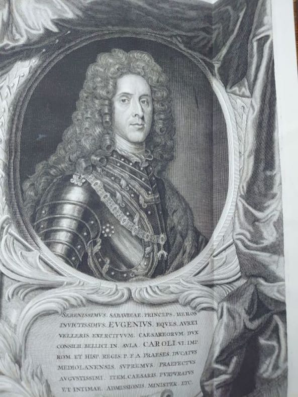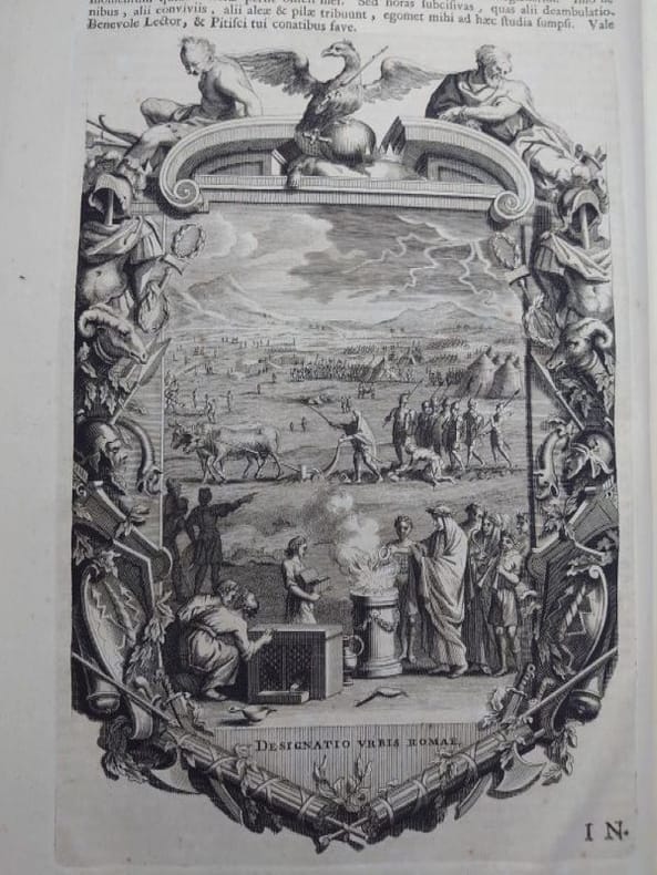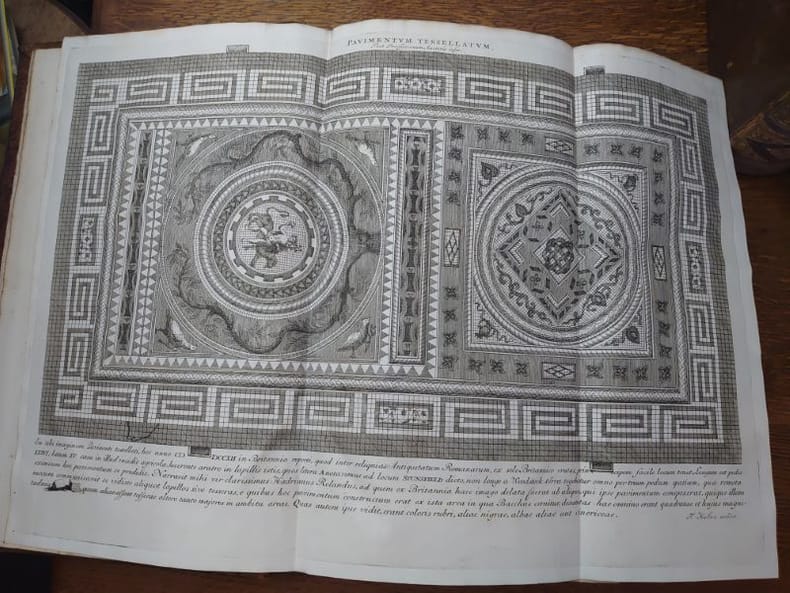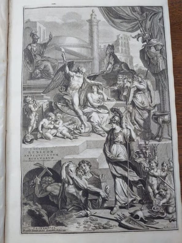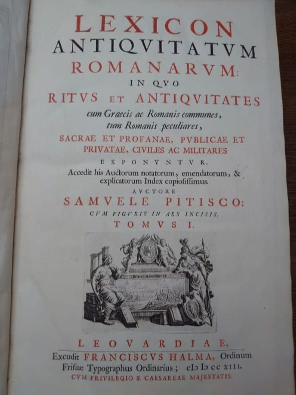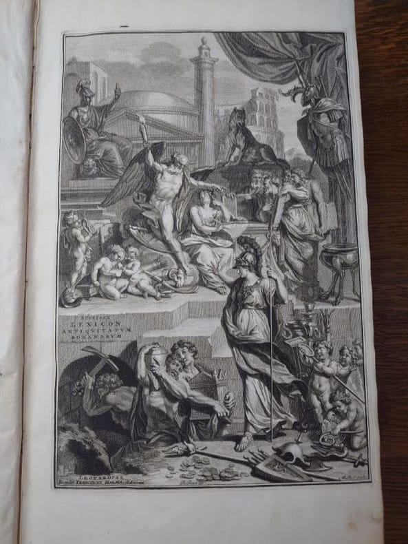 Leonardiae, Franciscus Halma, 1713. 40 x 26 cm. Premier volume : une page de titre gravée en frontispice, un portrait dépliant de Charles de Habsbourg, dit Charles VI, une planche dépliante de pavement mosaïqué (pavimentum tessellatum), un portrait gravé l'auteur, 40 ff. et 1008 pp. Deuxième volume : une page de titre gravée en frontispice, 1133 pp. Deux volumes plein veau reliés, dos à nerfs, caissons ornés, pièces de titre, tranches mouchetés. Reliures légèrement usés sinon beaux exemplaires. Planches gravées en très bel état, premier tirage. Ex-libris contrecollés dans les deux volumes de Petrus Saman (?).