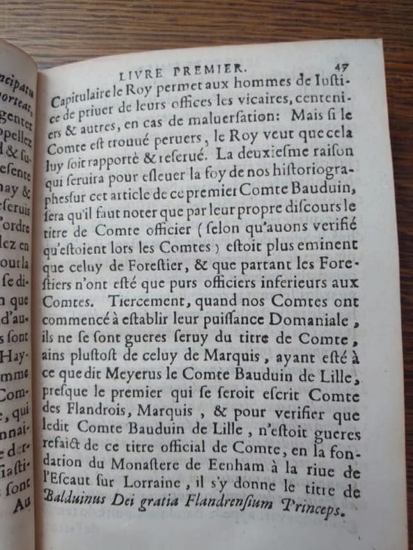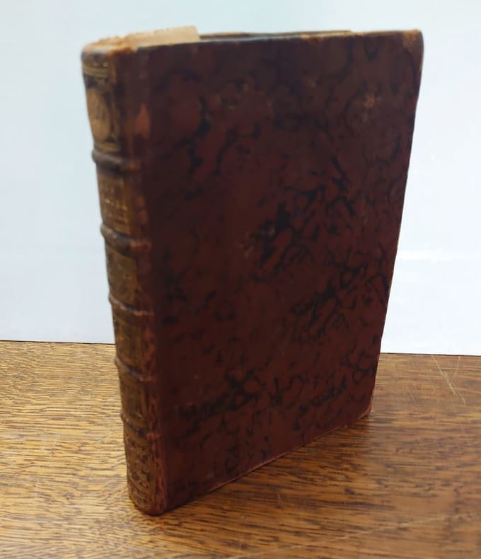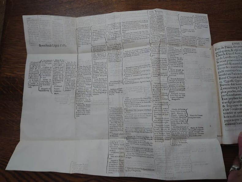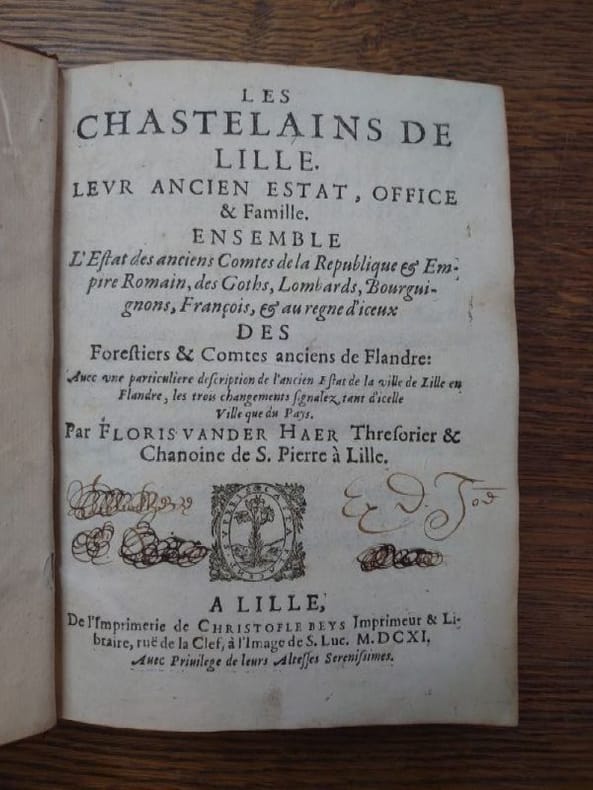 A Lille, Christophe Beys, 1611. 19,5 x 14 cm, 1 ff. et 300 pp. Relié plein veau marbré d'époque, dos à nerfs, caissons ornés, pièce de titre, tranches rouges. Reliure légèrement usée, traces de frottements, coins émoussés, une étiquette collée au dos, sinon bon exemplaire bien complet des 6 tableaux généalogiques dépliants.