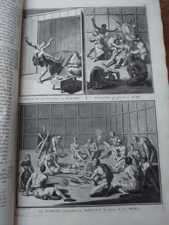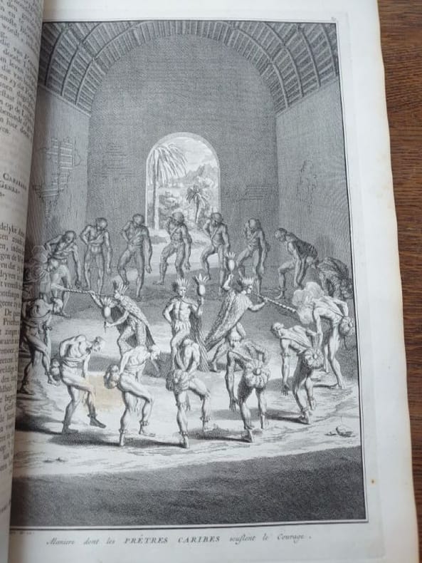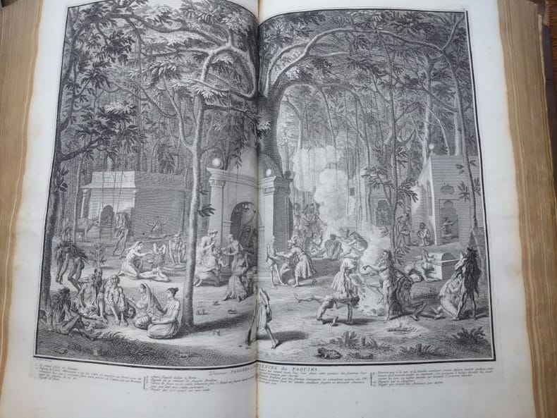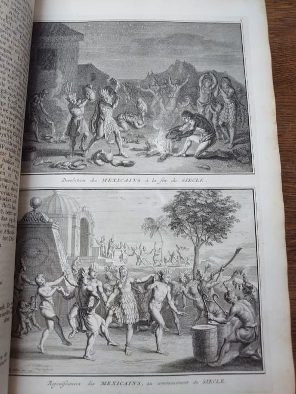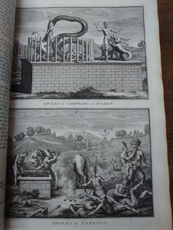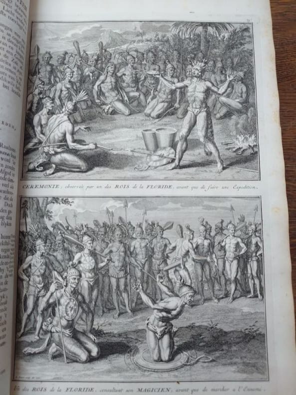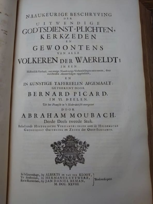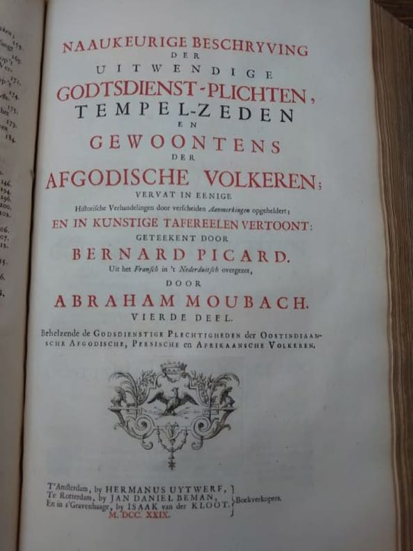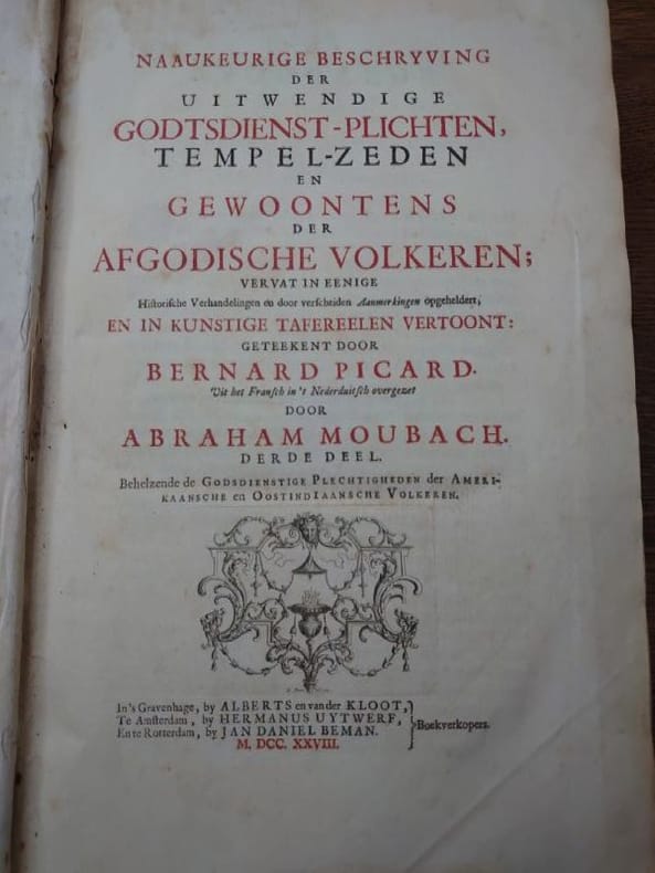 Deux tomes reliés en un volume. 41 x 27 cm, 3 ff.-187 pp.-2 ff.-229 pp.-4 ff. et 424 pp.-16 ff.45 planches gravées dans le volume 3 et 58 planches gravées dans le volume 4 (dont 6 à double page). une planche dépliante avec une légère déchirure sans manque sinon très bel état des gravures. Bien complet de toutes les planches.Relié plein veau d'époque, dos à nerfs, caissons ornés, pièce de titre, encadrement de filets et roulettes sur les plats. reliure usée mais encore très solide, mors partiellement fendue, coins très émoussés, coiffes usées. Mais intérieur dont les planches en bel état.Il s'agit de la traduction néerlandaise du livre Cérémonies et Coutumes Religieuses de tous les Peuples du Monde, représentées par des figures dessinées de la main de Bernard Picart: avec une explication historique, & quelques dissertations curieuses. Ces deux volumes traitent de l'Amérique, de la Chine, des Indes.