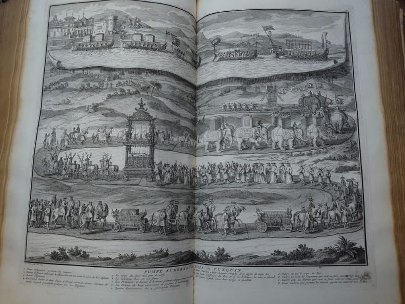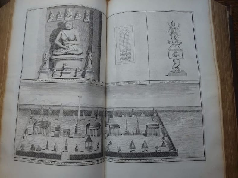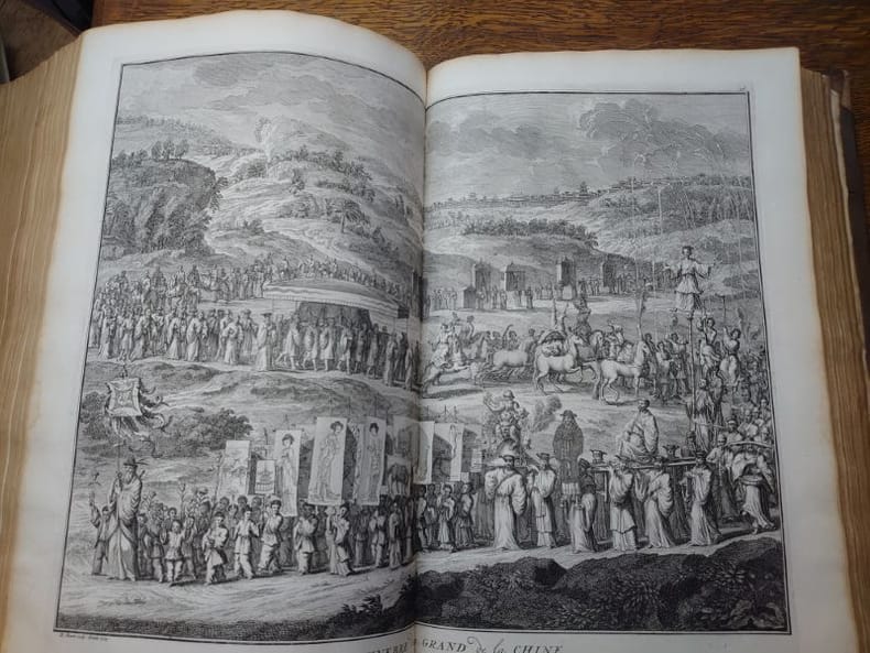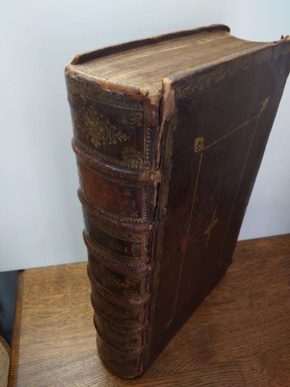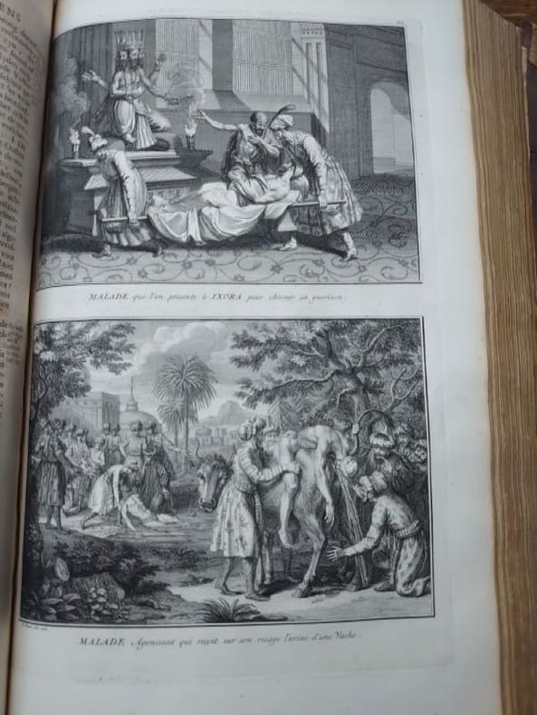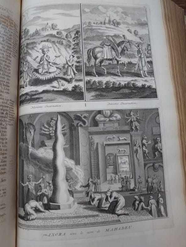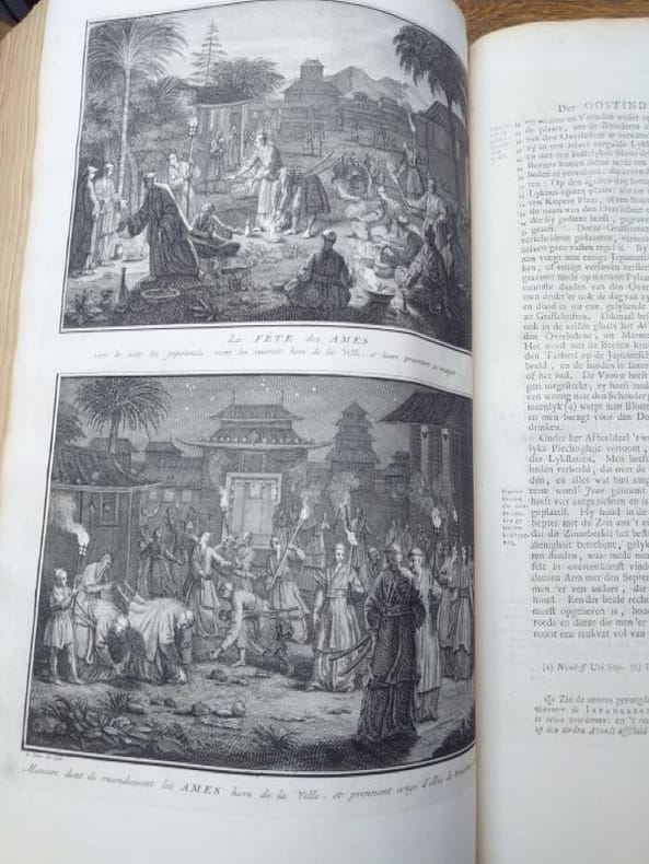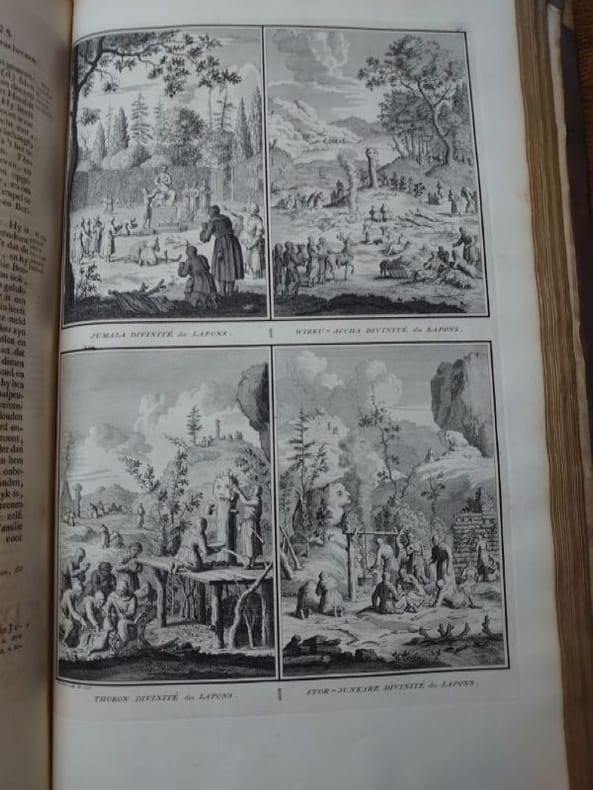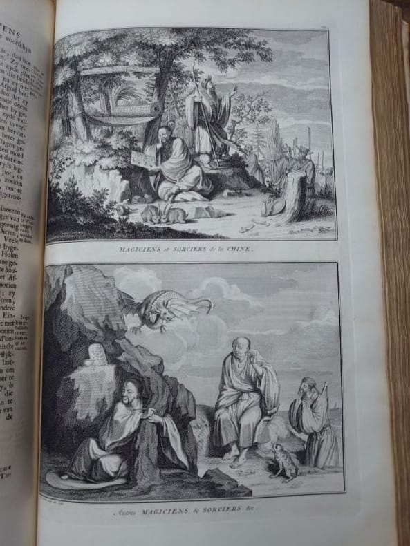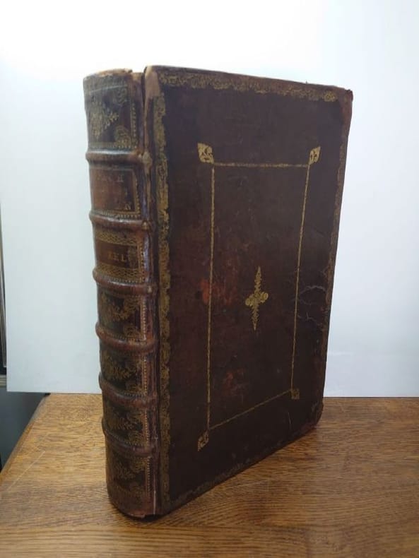Deux tomes reliés en un volume. 41 x 27 cm, 3 ff.-187 pp.-2 ff.-229 pp.-4 ff. et 424 pp.-16 ff.45 planches gravées dans le volume 3 et 58 planches gravées dans le volume 4 (dont 6 à double page). une planche dépliante avec une légère déchirure sans manque sinon très bel état des gravures. Bien complet de toutes les planches.Relié plein veau d'époque, dos à nerfs, caissons ornés, pièce de titre, encadrement de filets et roulettes sur les plats. reliure usée mais encore très solide, mors partiellement fendue, coins très émoussés, coiffes usées. Mais intérieur dont les planches en bel état.Il s'agit de la traduction néerlandaise du livre Cérémonies et Coutumes Religieuses de tous les Peuples du Monde, représentées par des figures dessinées de la main de Bernard Picart: avec une explication historique, & quelques dissertations curieuses. Ces deux volumes traitent de l'Amérique, de la Chine, des Indes.