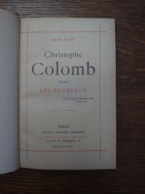 Léon Bloy, Christophe Colomb devant les Taureaux. Paris, Albert Savine, 1890. Petit in-12, [6]-VI-225p. Edition originale. Plein chagrin brun, couvertures conservées, dos légèrement passé. Bon exemplaire.