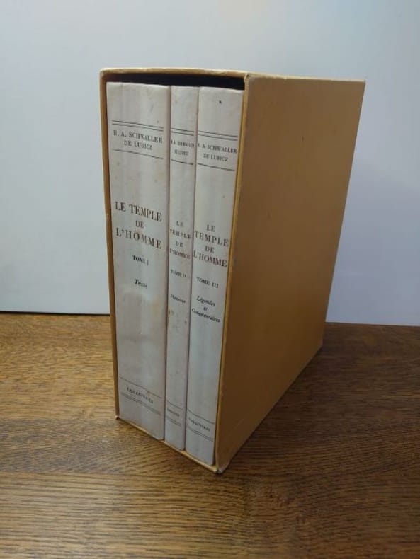 Paris, Caractères, 1957. 28 x 22,5 cm, 776 pp., 16 pp. et CI planches, 410 pp. Trois volumes, brochés, sous étui. 300 figures dans et hors texte, Couvertures légèrement usées, sinon, bons exemplaires, intérieur très frais. Édition originale tirée à 1000 exemplaires sur vélin supérieur. Le volume II a été tiré sur pur chiffon couché. L'oeuvre majeure de Schwaller de Lubicz : pensée pharaonique, symbolique, mathématiques babyloniennes, systèmes de calculs et de mesures égyptiens.