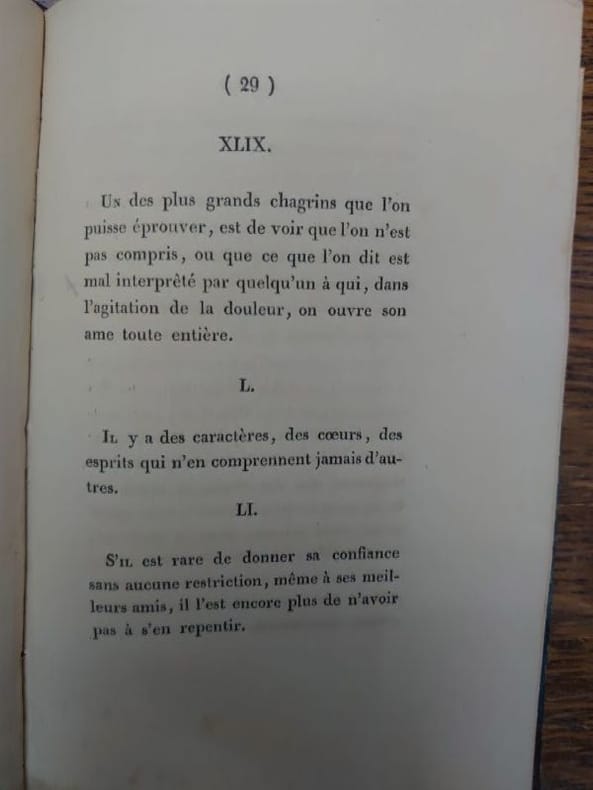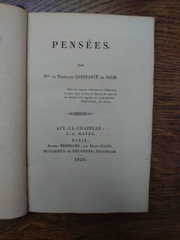 Aix-la-Chapelle, J.-A. Mayer, Paris, Arthus Bertrand, Ponthieux et delaunay, 1829. 17,5 x 11 cm, 96 pp. Relié demi-basane à coins dos à nerfs orné, titre doré. Reliure légèrement usée sinon bon exemplaire. Édition originale. Des éditions augmentées de ce texte parurent en 1835 et 1838. Constance de Salm y traite, entre autre, de l'éducation négligée des femmes, de l'attitude dominante des hommes, des devoirs du monde, de la félicité domestique. Constance de Salm (1767-1845, née Constance de Théis, par son premier mariage Pipelet de Leury et par son second mariage princesse de Salm-Dyke) est une poétesse et femme de lettres française. Chénier la qualifia de « Boileau des femmes ». Sa prose et ses idées féministes ont connu une belle diffusion, notamment grâce au salon littéraire quelle animait, fréquenté par Alexandre Dumas, Stendhal ou encore le marquis de La Fayette.