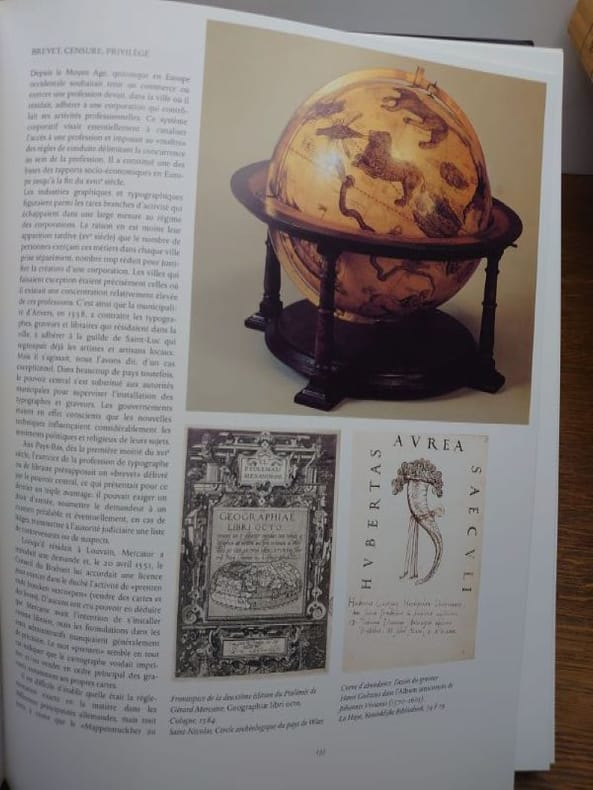 Imprimé sur papier couché ; l’illustration est exceptionnelle : environ cinq cents figures dans le texte (vignettes, pleines et doubles pages, deux sur quatre pages) la plupart en couleurs ; quant aux textes, sous la direction de Marcel WATELET, une vingtaine d’auteurs ont contribué à la rédaction de la plus importante « somme » consacrée à Gérard De Kremer, plus connu sous son nom latinisé : Gerardus MERCATOR (Rupelmonde, 1512 – Duisbourg, 1594). L’ouvrage est divisé en cinq parties, (historique), (géographie), « l’outillage, les sciences et les techniques » (citons, -presque- au hasard : « la bibliothèque de Mercator », avec le « catalogus » en fin de volume et « le monde de l’édition et du livre »), « la représentation de l’espace » (globes, cartes - dont Palestine, Flandre, « Gallia », etc.-) et enfin, « la famille, l’héritage ». In fine, bibliographie et deux index (noms, lieux). Splendide ouvrage, dans la continuité des productions du Fonds Marcator. GAR (V3 G)