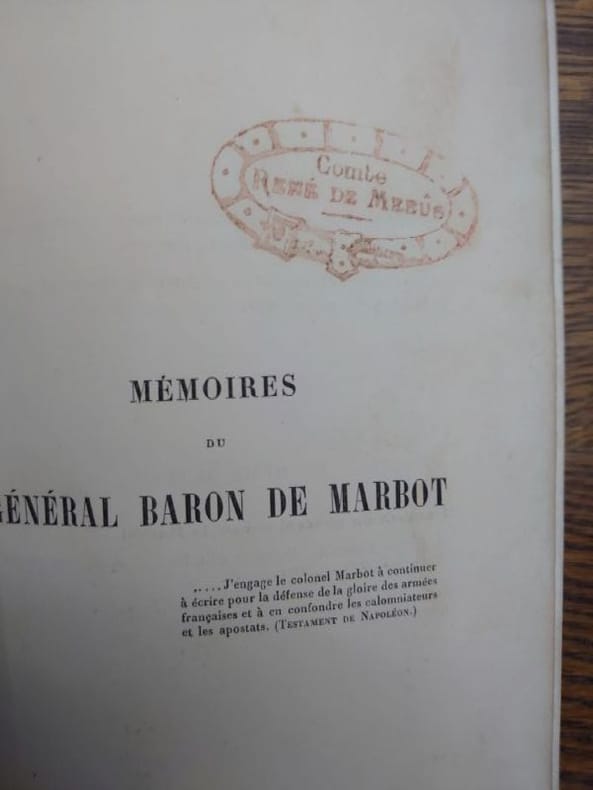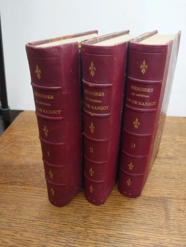 Paris, Librairie Plon, 1891. 22 x 13,5 cm, xii-390-495 et 446 pp., 3 frontispices dont 2 portraits du général Marbot, 2 fac-similés d'autographes repliés. Trois volumes relié demi-chagrin, dos à nerfs, caissons ornés. Reliures légèrement usées sinon bons exemplaires. Provenance : ex-libris tampon du Comte René Meeûs, et étiquette du Comte Jean De Meeûs.