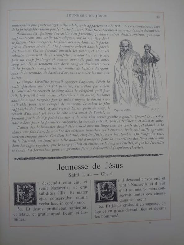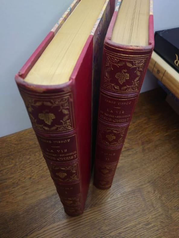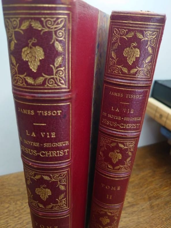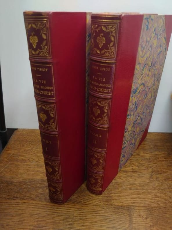 Tours, Maison Alfred Mame et fils, 1896-1897. 34 x 27,5 cm, xii-272 pp. et 279 pp. Deux volumes reliés demi maroquin rouge à coins, dos à nerfs, caissons ornés, têtes dorées, sous étuis. Etuis usées, des traces de frottements, un mors du tome II légèrement fendu sinon beaux exemplaires.Orné de compositions de James Tissot (lithographie et taille-douce), dont 37 planches pleine page hors-texte, en couleurs, sous serpentes, de nombreuses vignettes et lettrines en noir dans le texte. James Tissot (1836-1902), peintre français de la haute société de l'époque victorienne, exilé à Londres suite à la guerre de 1870, eut une crise mystique en 1888. Parti en Terre Sainte, il rapporta des aquarelles illustrant la vie du Christ que l'on retrouve dans l'ouvrage.