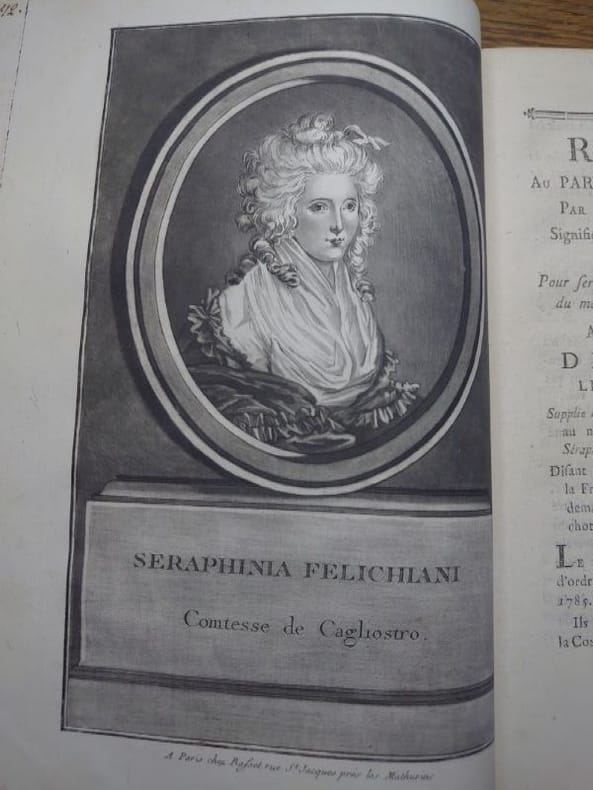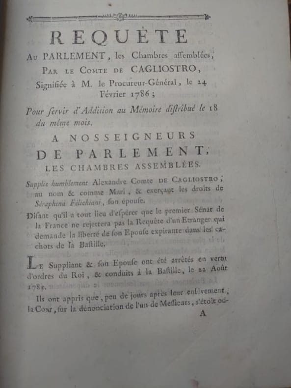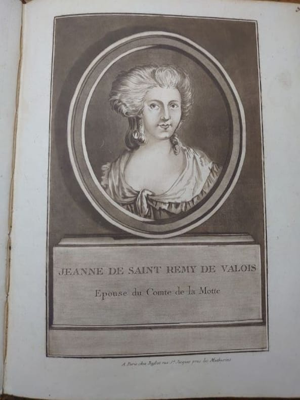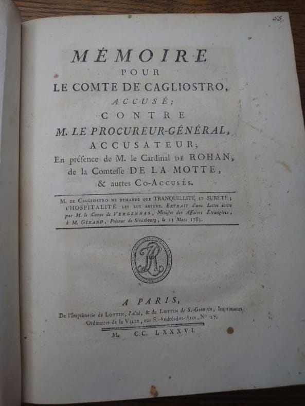 Contenus dans ce volume 26 x 21,5 cm, in-quarto relié plein veau moucheté, dos à nerfs, caissons ornés, pièces de titre, encadrement de triple filets sur les contreplats. Reliure légèrement usée coiffe supérieure abîmée, coiffe inférieure arasée, manque à une pièce de titre, traces de frottements, mors très légèrement abimés, sinon bel exemplaire. Avec 6 gravures hors-texte, portraits. - Mémoire pour Dame Jeanne de Saint Rémy de Valois, épouse du Comte de la Motte. De l'Imp. de Cellot, Paris, 1785. 46 pp. Avec deux gravures hors-texte, portraits du Prince de Rohan et de Jeanne de Saint Rémy de Valois. - Mémoire pour le comte de Cagliostro accusé : contre M. le Procureur-général, accusteur, en présence de M. le Cardinale de Rohan, de la Comtesse de La Motte, et autres co-accusés. A Paris, de l'Imprimerie de Lottin, 1786. 51 pp. Avec une gravure hors-texte, portrait de Cagliostro. - Requête au Parlement, les Chambres assemblées, par le Comte de Cagliostro, signifiée à M. le Procureur-Général, le 24 Février 1786. 7 pp. A Paris, de l'Imprimerie Lottin, 1786. Avec une gravure hors-texte, portrait de Seraphinia Felichiani, Comtesse de Cagliostro. - Mémoire à consulter pour Jean-Charles-Vincent de Bette d'Etienville, Bourgeois de Saint-Omer en Artois, détenu ès prison du Châtelet de Paris, Accusé, contre le Sieur Vaucher, Marchand Horloger, & le Sieur Loque, Marchand Bijoutier à Paris, Plaignans. Paris, de l'Imprimerie de L. Cellot, 1786. 30 pp. Avec une gravure hors-texte, portrait de Bette d'Etienville. - Mémoire pour la Demoiselle Le Guay d'Oliva, fille mineure, émancipée d'âge, accusée ; contre M. Le Procureur Général, Accusateur ; en présence de M. le Cardinal de Rohan, de la dame De La Motte-Valois, du sieur de Cagliostro, & autres ; tous co-accusés, Chez P.G. Simon & N. H. Nyon, Paris, 1786. 46 pp. Avec une gravure hors-texte, portrait de mademoiselle Leguet d'Esigny d'Olisva. - Second Mémoire à Consulter et Consultation, sur la Défense à une Accusation d'Escroquerie, pour Jean-Charles-Vincent de Bette d'Etienville, Bourgeois de Saint-Omer en Artois, De l'Imprimerie de Cailleau, Paris, 1786. 29 pp. - Mémoires pour M. le Baron de Fages-Chaulnes, Garde-du-Corps de Monsieur, Frère du Roi, Accusé, contre les Sieurs Vaucher et Loque, Marchands Bijoutier, Accusateurs, Chez Prault, Paris, 1786. 30 pp. - Réponse pour la comtesse de Valois-La Motte, au mémoire du comte de Cagliostro. A Paris, de l'Imprimerie Cellot, 1786. 48 pp; - Mémoire justificatif pour Trois Hommes condamnés à la Roue. A Paris, de l'Imprimerie de Philippe-Denys Pierres, 1786. 251 pp. Important recueil sur la fameuse Affaire dite des Roués de Chaumont qui défraya la chronique judiciaire dans les dernières années de l'Ancien Régime, nourrissant un nouveau procès contre la justice et les magistrats : trois habitants de Chaumont avaient été en 1785 condamnés à tort pour vols nocturnes avec effractions et violence par le bailliage de leur ville, et la sentence avait été aggravée en seconde instance devant le Parlement de Paris en conséquence de l'appel a minima du procureur du Roi ; Dupaty (1746-1788) s'empara de ce cas et réussit à obtenir révision de la procédure et libération des accusés. - Lettre de M. le Vicomte d'Ars, capitaine de dragons dans le Régiment de S.A.S. Monseigneur le Duc de Penthievre. Sans lieu, sans nom d'éditeur, 1785. 10 pp.