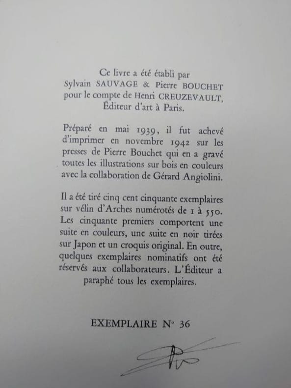 Paris, Creuzevault, 1942. 25 x 16 cm, en feuilles sous couvertures rempliées sous emboîtage. emboitage légèrement usé sinon bon exemplaire. Exemplaire paraphé par l'éditeur, n° 36/550, un des 50 premiers comprenant un croquis original de Sylvain Sauvage et une double suite noir et couleurs sur papier Japon. Ex dono manuscrit non identifié sur une page de garde.