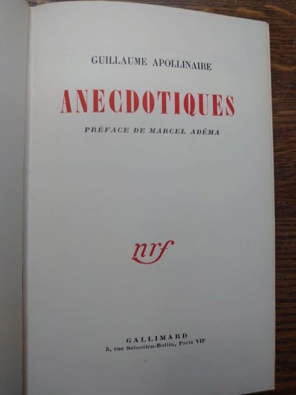 Paris, Gallimard, 1955. 18,2 x 12 cm, 332 pp. Relié cartonnage d'éditeur en bel état. Tirage limité à 550 exemplaires numérotés sur vélin labeur dans un cartonnage de Paul Bonet. C'est la première édition en livre de l'intégralité des chroniques publiées par Apollinaire dans le Mercure de France sous le titre "La Vie anecdotique", faisant voisiner les prophéties, le futurisme, la cuisine, Victor Hugo et Alfred Jarry...
