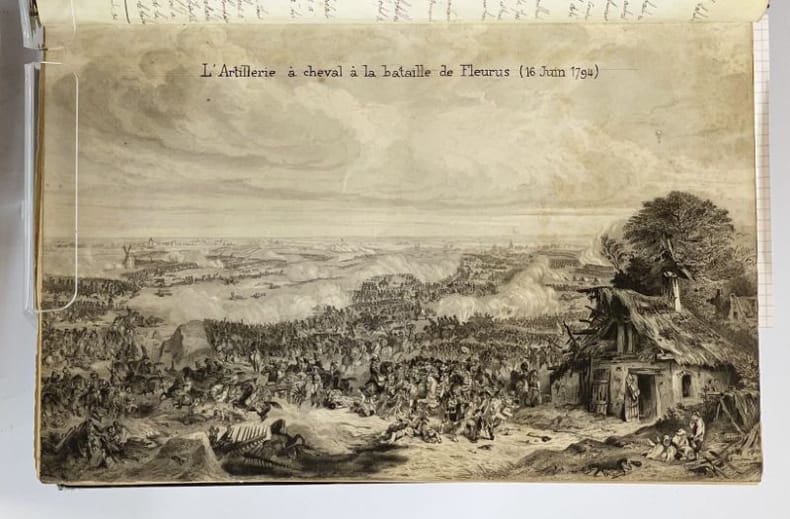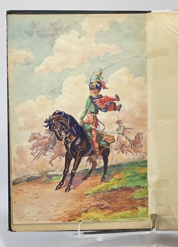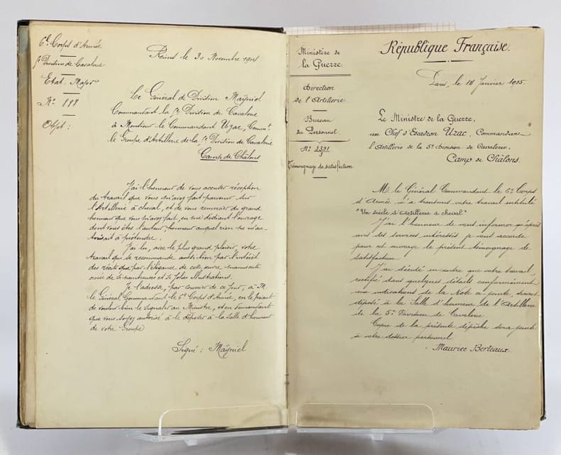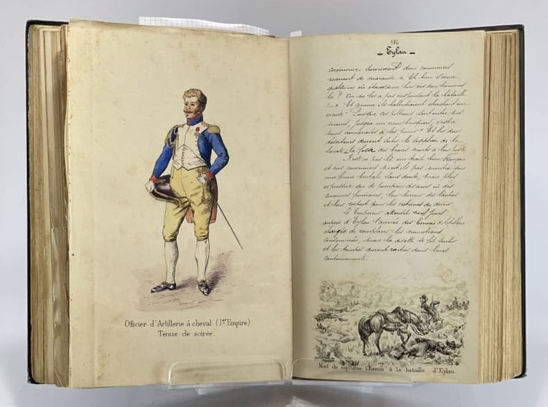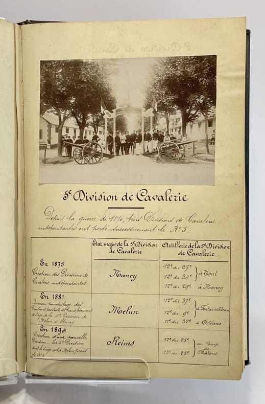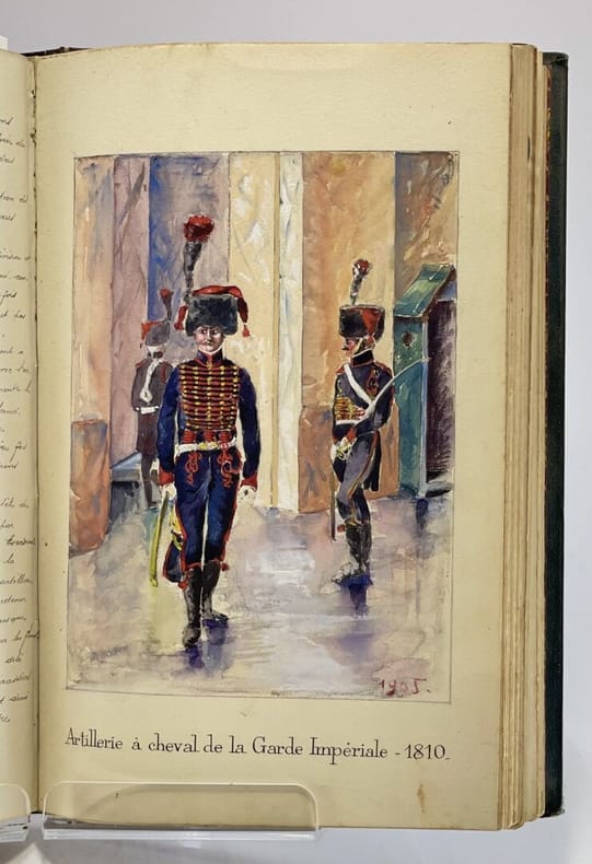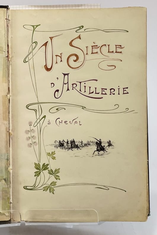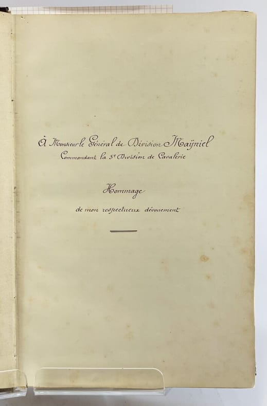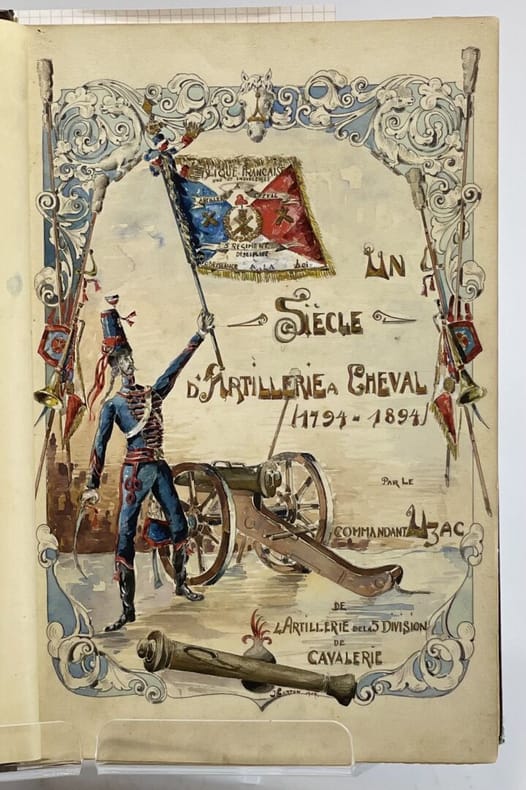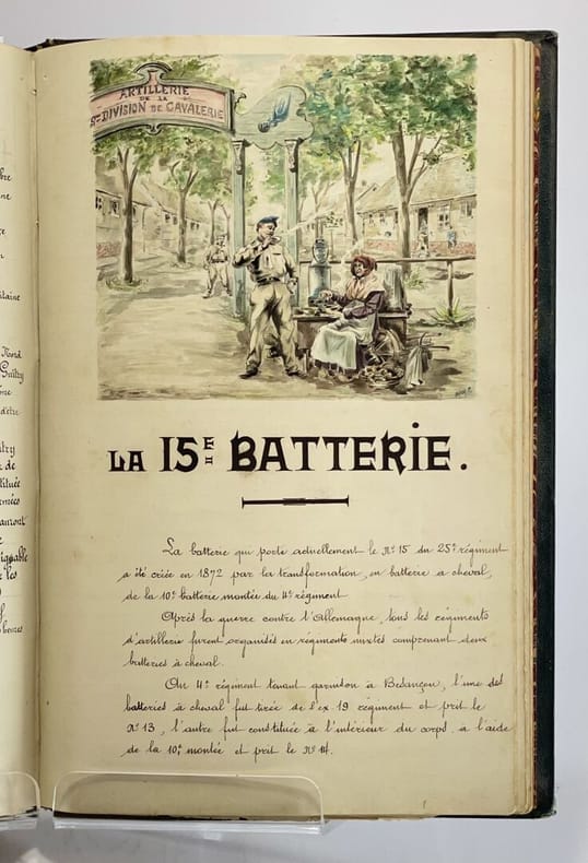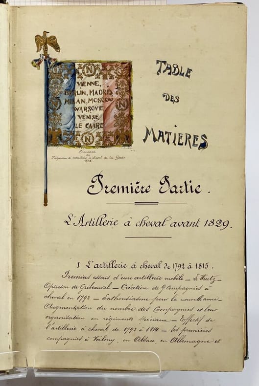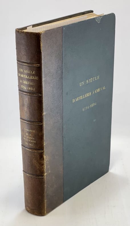 34 x 23 cm, [36]-509 p. : ill., [13] ff. de pl. Relié, demi-chagrin brun, plats en toile vert impérial, titre doré au premier plat et sur le dos, à 5 nerfs. Ouvrage entièrement manuscrit illustré de planches (parfois gravées, parfois dessinées) et de 93 dessins à l'encre et à l'aquarelle dans le texte très finement réalisés, de même que les pages de titre et en tête des chapitres, une photographie. D'après la note liminaire de l'auteur : "Le présent travail contient le récit de nombreux exploits accomplis par l'artillerie à cheval et a été rédigé pour servir à l'instruction morale et patriotique des batteries de la 5e division de cavalerie". Le texte est précédé de deux lettres (retranscrites) du Général de division Maijniel, commandant de la 5e division de cavalerie et de Maurice Berteaux, Ministre de la Guerre, témoignant de leur satisfaction pour ce travail.Dos passé, épidermures, très rares rousseurs pâles, quelques feuillets détachés, jonction entre contre-plats et gardes renforcée avec de l'adhésif, bon état général.