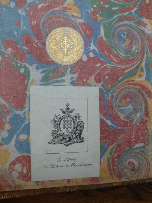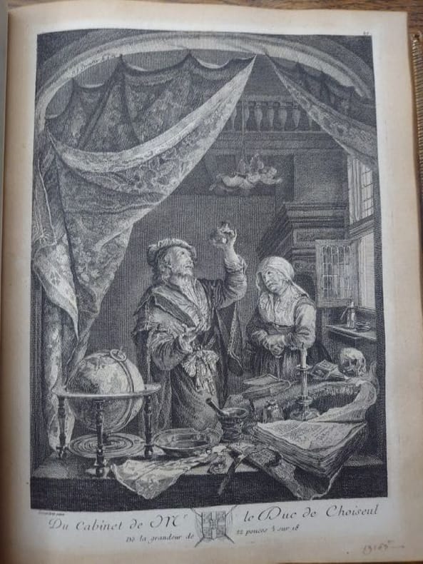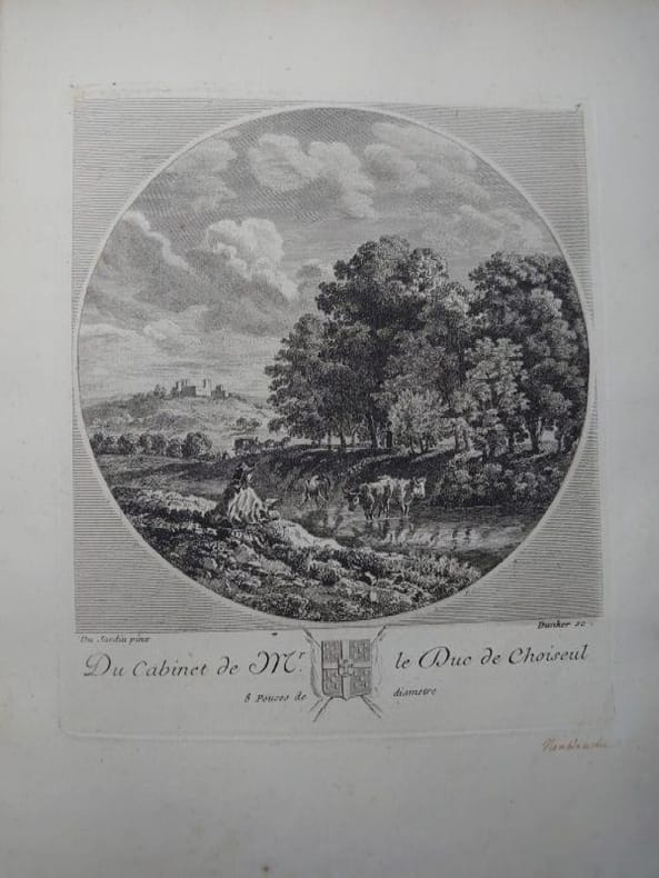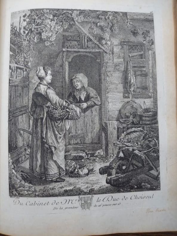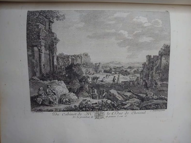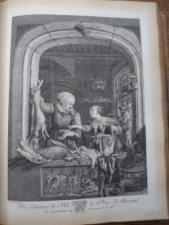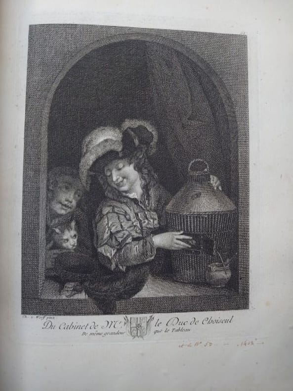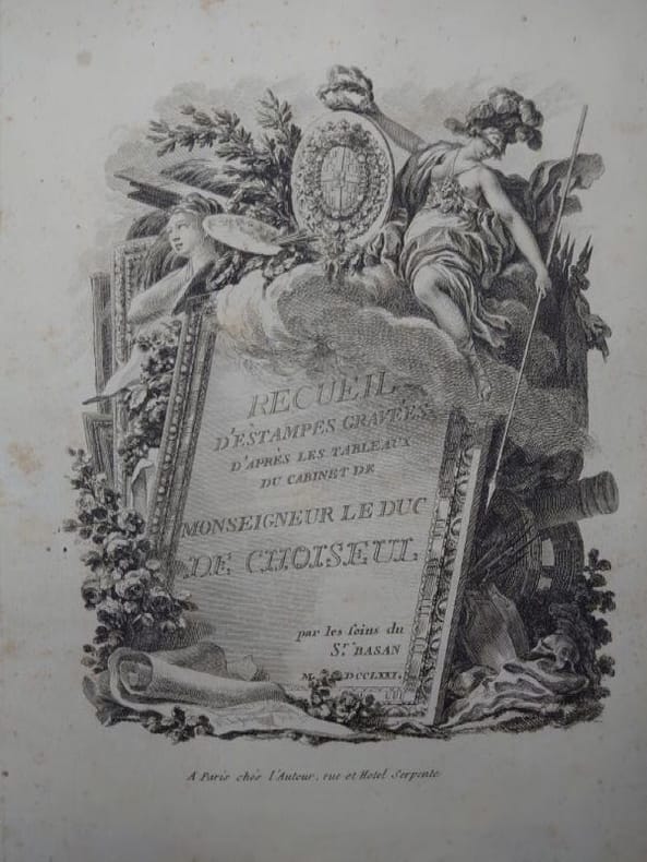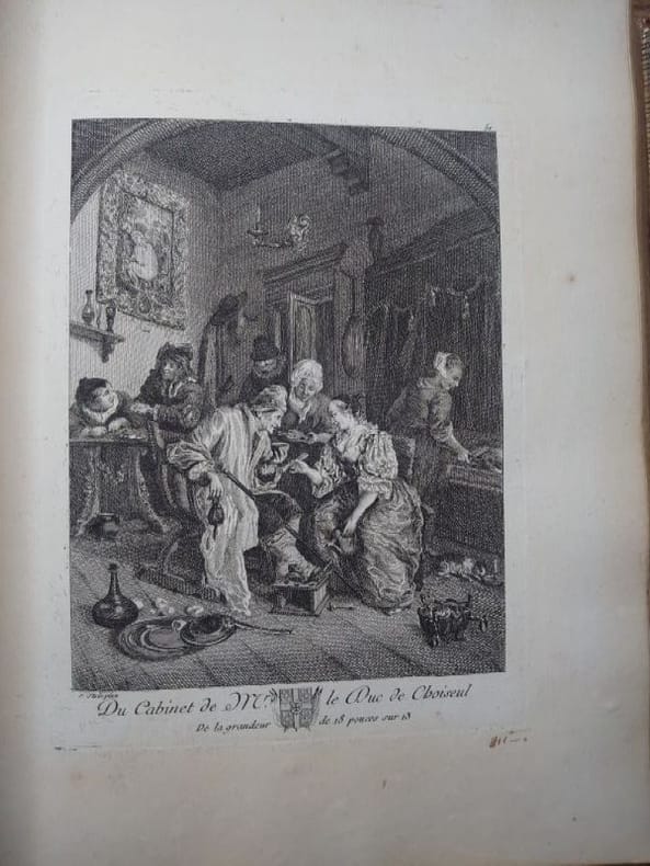 A Paris, chez l'auteur, 1771. 26 x 21,5 cm, titre gravé par Choffard avec dédicace gravée au verso, un portrait du duc de Choiseul, 12 pages de texte gravées et 127 (sur 128) planches gravées numérotées de 1 à 123 (à l'exception de la planche 4 manquante), y compris les figures 44 et 45 gravées sur une seule planche, les 5 planches bis 68, 69, 76, 78 et 101, la planche 74 sur une double page, les figures 93 et 94 sur une seule planche. Les planches sont sous serpente. Des rousseurs sinon bon état des planches. Relié plein veau d'époque, dos à nerfs, pièce de titre, toutes tranches dorées. Reliure usée mais encore solide. Mors partiellement fendus, épidermures, cois émoussés, coiffes arasées. Au centre des plats armoiries dorées du baron de Cartier et de Cartier de Marchienne. Provenance : sur le contreplat ex-libris du Château de Marchienne et ex-libris du bibliophile anglais James Toovey. Avec des annotations manuscrites des prix lors de la vente de 1772. Recueil bien gravée, d'après les tableaux que le duc de Choiseul vendit après sa disgrâce en 1772. Les planches figurent des tableaux de Van de Velde, J. Steen, David Teniers, Rubens, Van Dyck, Le Nain, Hubert Robert...