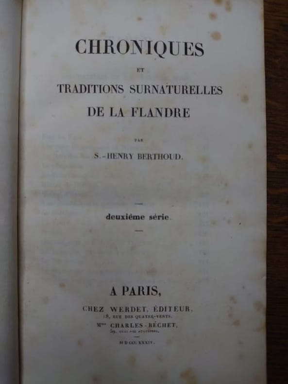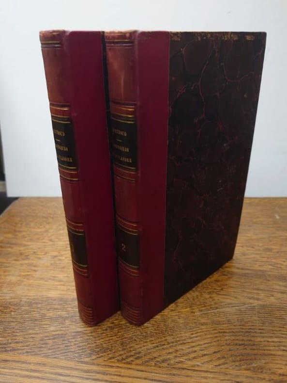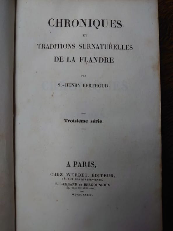 A Paris, chez Werdet, 1834. 21 x 13 cm, 384 et 360 pp. Deux volumes reliés demi veau rouge, dos à nerfs, pièces de titre. Avec 8 gravures hors texte dans la deuxième série et une gravure hors texte dans la troisième série. Des rousseurs sinon beaux exemplaires. Fils d'un libraire-imprimeur cambraisien, Samuel-Henry Berthoud (1804-1891) a laissé de nombreux romans, notamment pour la jeunesse, ce qui en fit le premier rédacteur en chef du "Musée des familles" de 1834 à 1842. La première série des ces chroniques fut publié en 1831,et en 1834 il publiera ces deux autres volumes de ces contes diaboliques tirés du folklore flamand. Provenance ; ex-libris contrecollé sur le contreplat du baron de Henin de Boussu-Walcourt.