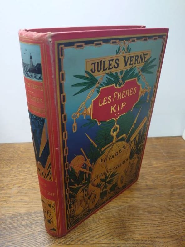 Paris, Hetzel, s. d. [1902-1904]. 28 x 18,5 cm, 460 pp. Première édition in-8 illustrée de 59 dessins de George Roux. Cartonnage d'éditeur Hetzel au globe doré, plaque signée Blancheland, reliée par Engel, dos au phare, second plat de type Engel "h" selon Jauzac. Coiffes et coins légèrement émoussés, une cassur au milieu de l'ouvrage. État moyen. Coins un peu tordus, sinon agréable exemplaire. Les Frères Kip est un roman policier et d'aventures, sans doute inspiré d'une affaire judiciaire de la fin du XIXème siècle : les frères Rorique.