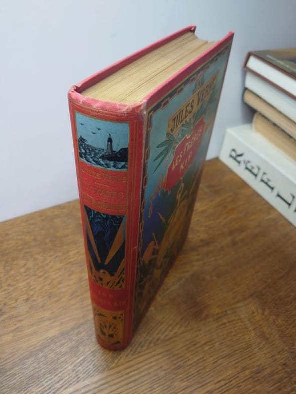 Hetzel.(s.d).Autour de 1902.In-8 en percaline,polychromie en 2 parties.459 p.Ills.de George Roux.Chromotypographies .BE.Au globe doré.Dos au phare.Initiales JH au dos.Tranches dorées.Rares rousseurs.Coiffes et coins légèrement émoussés.